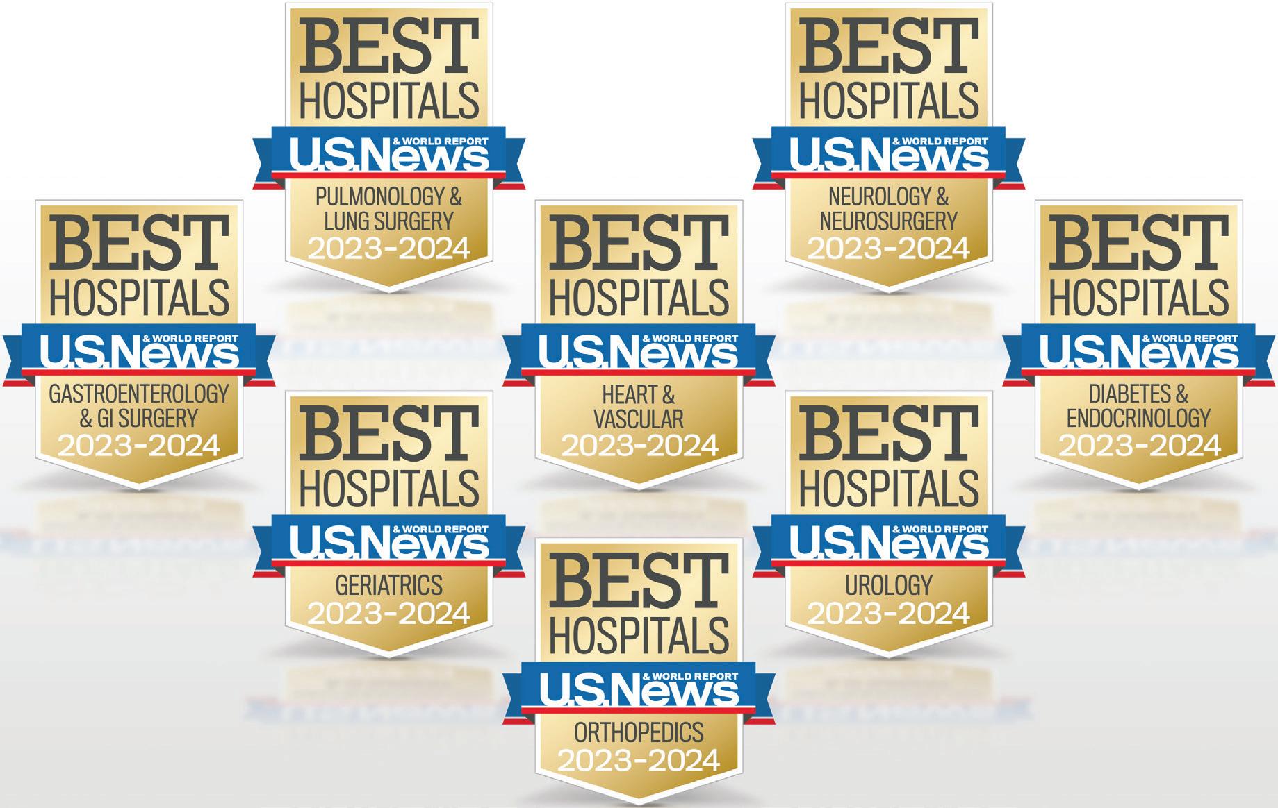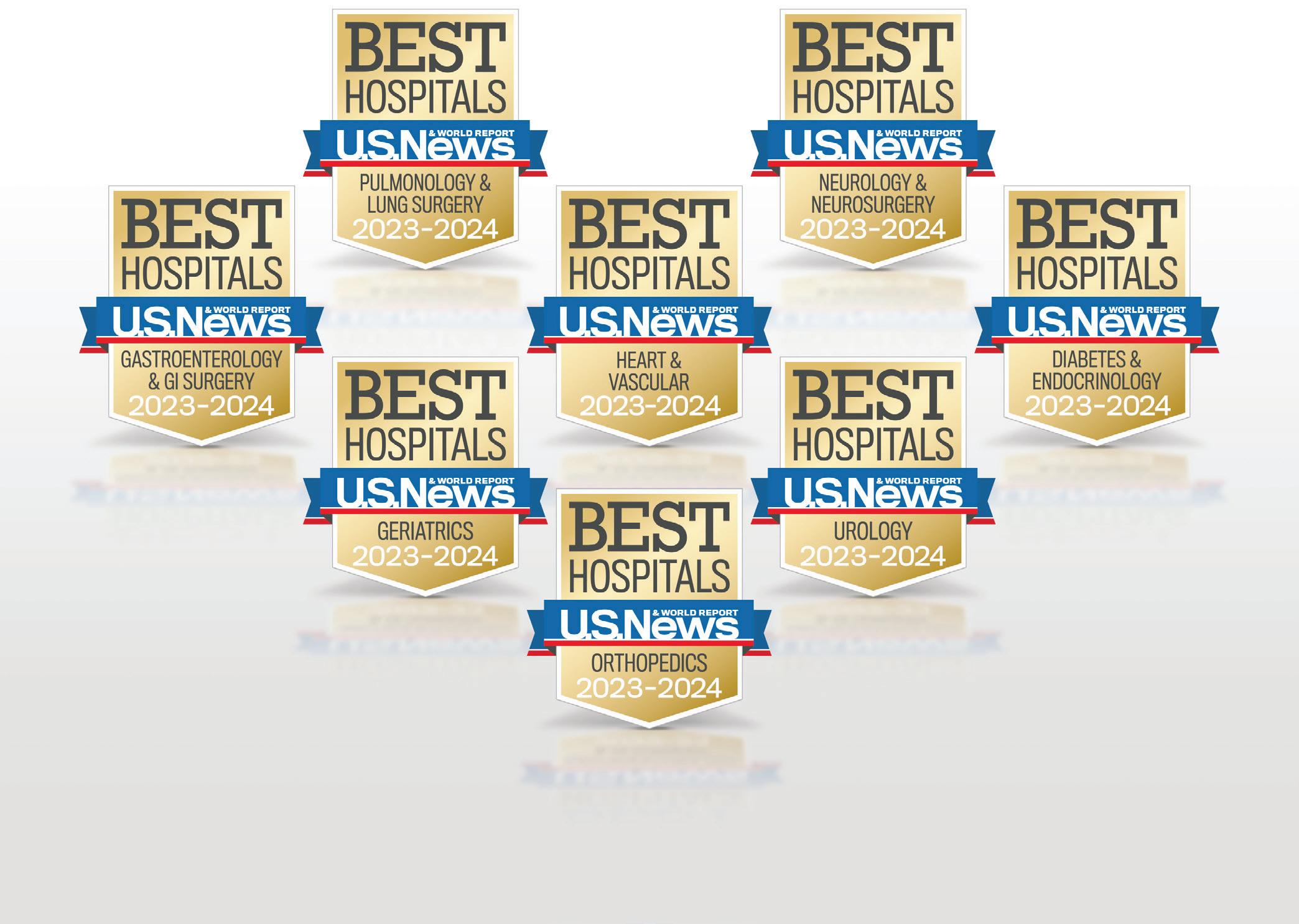 The hospital is nationally ranked in eight adult specialties— upholding its 2023 record—including: heart and vascular, orthopedics, geriatrics, gastroenterology and GI surgery, neurology and neurosurgery, diabetes and endocrinology, pulmonology and lung surgery, and urology.