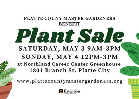 Sat, May 3, 10a-3p and Sun, May 4, Noon3p; in the Greenhouse located at the Northland Career Center, 1801 Branch St, Platte City, MO 64079. This 1st annual plant sale will offer a variety of perennials, natives, annuals and herbs. The sale happens rain or shine. Proceeds benefit the MU Extension Master Gardeners of Platte County. www.plattecountymastergardeners.org; plattemgs@gmail.com