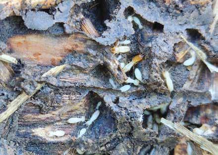 Termites work together as a team to break down wood and create a large nest for their colony.