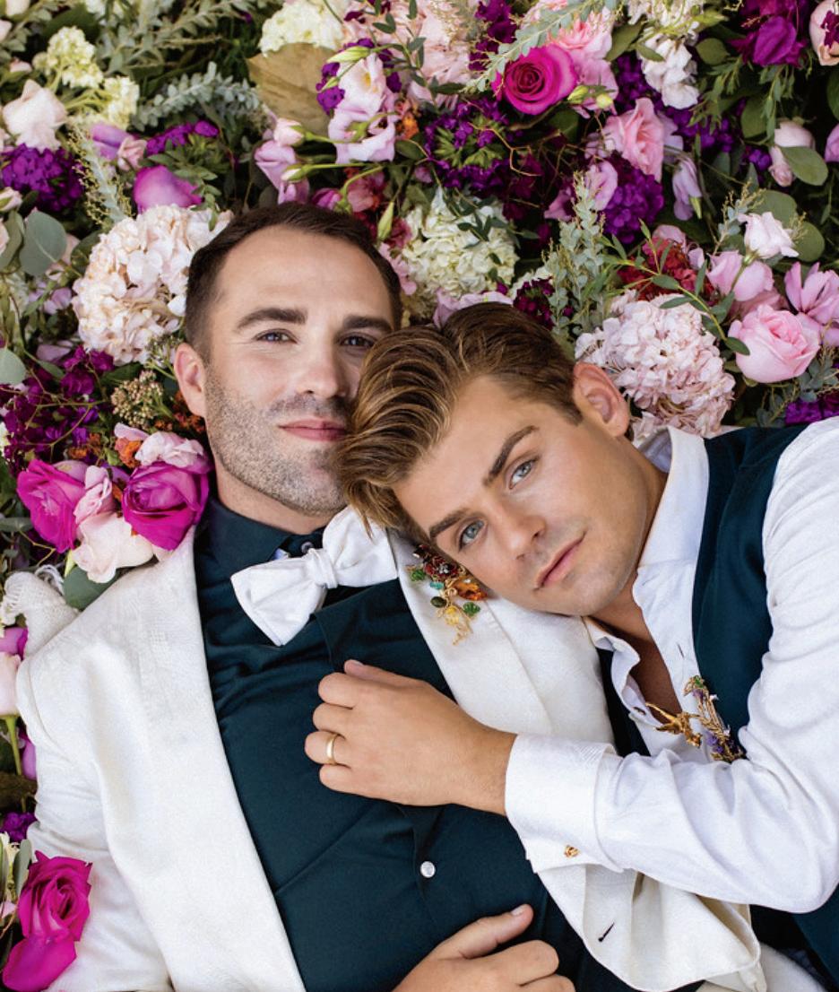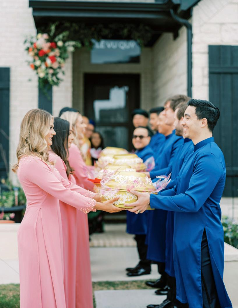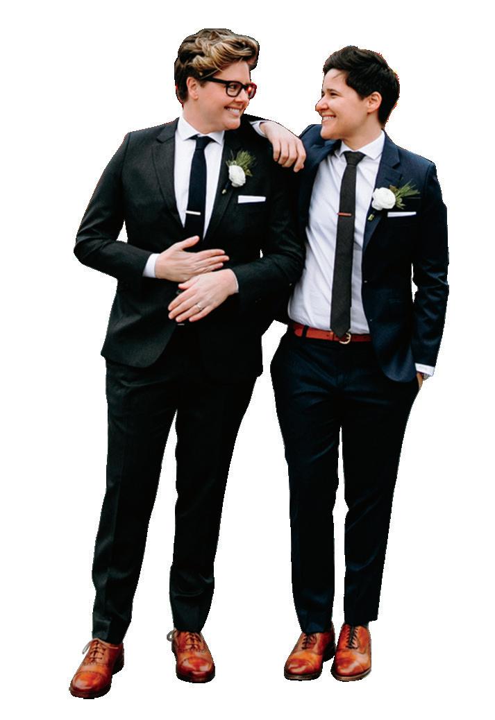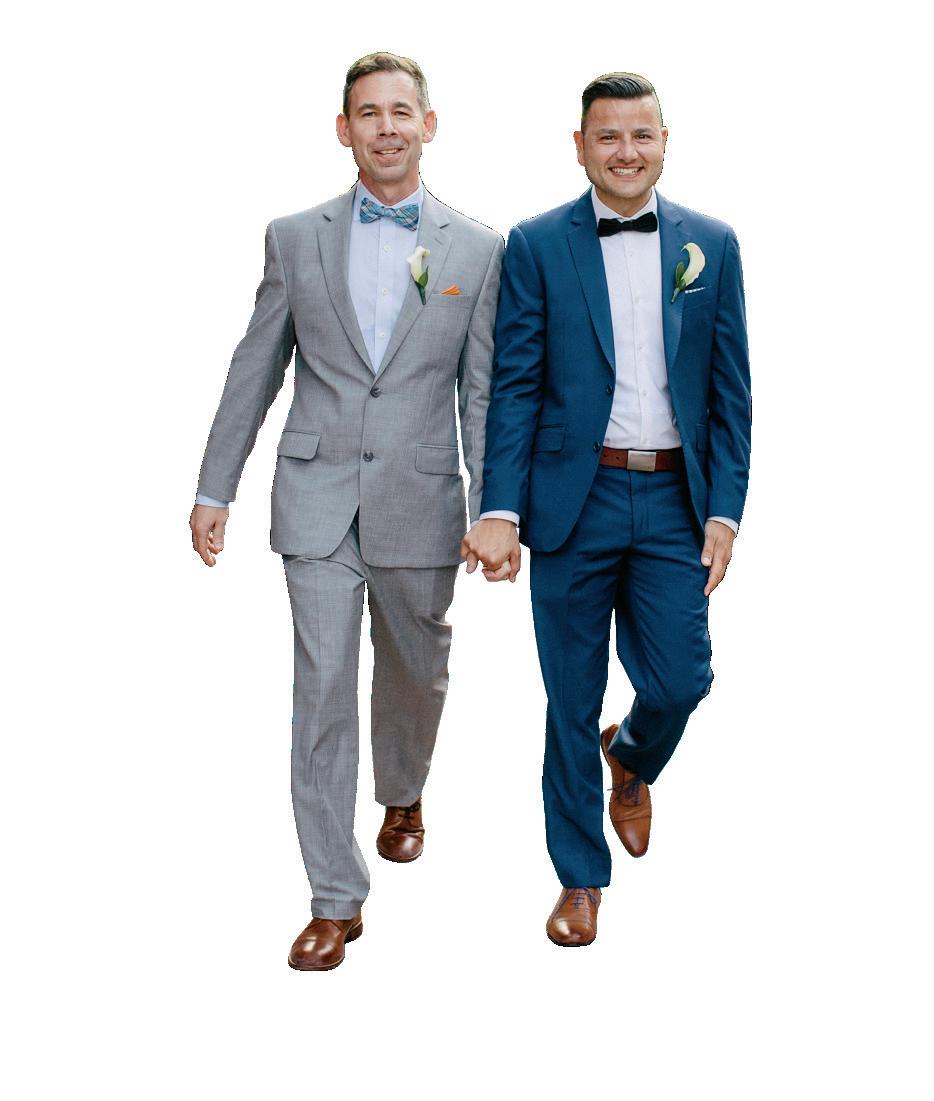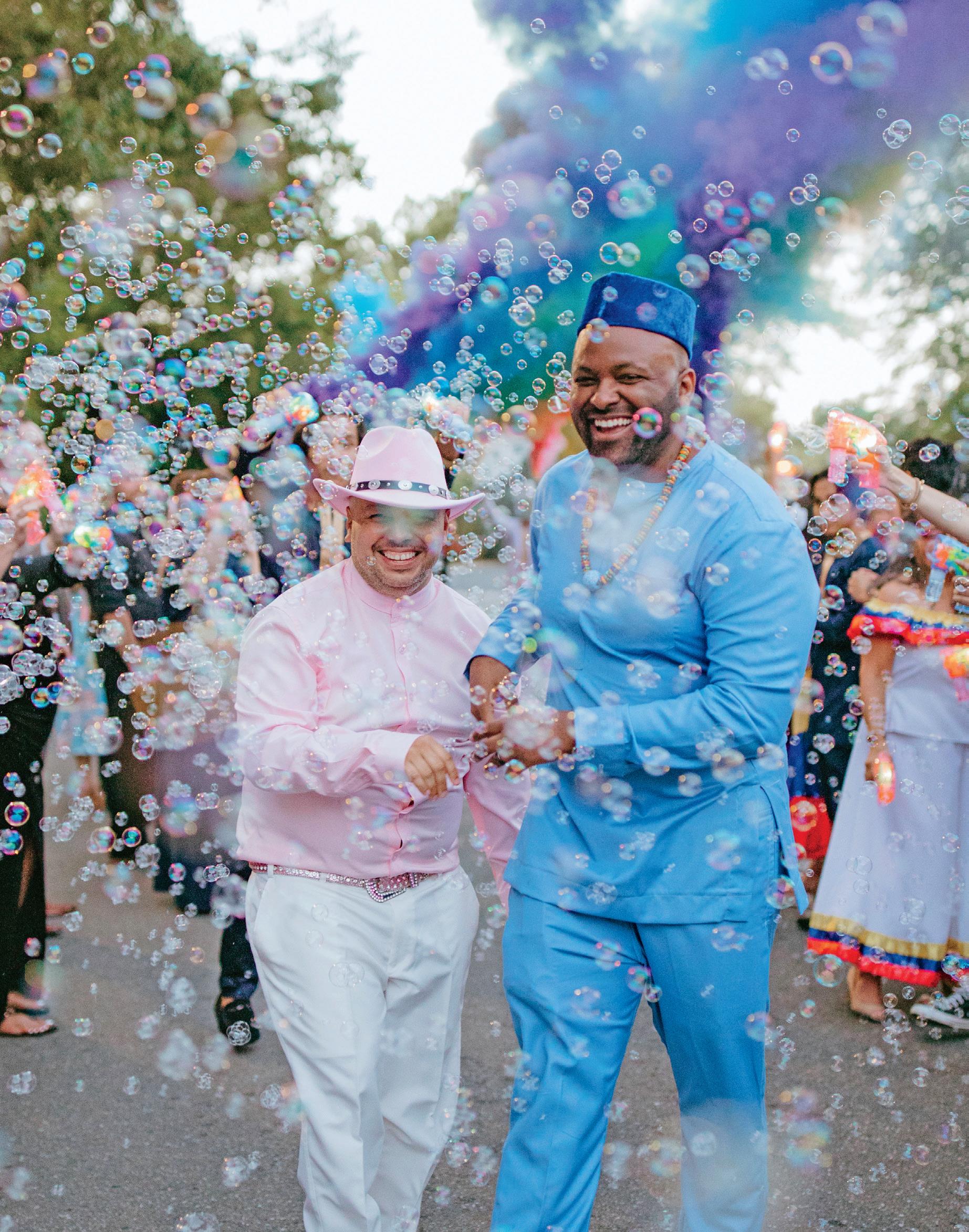 For our send-off, we wanted to honor Pride Month and the seventh anniversary of the Supreme Court ruling that legalized same-sex marriage. To do that, we dressed in attire that aligned with the colors of the transgender flag. Our wedding party shot off smoke cannons in the colors of the Pride flag, and the rest of our family and friends had bubble shooters. We loved including the people most important to us in our exit!