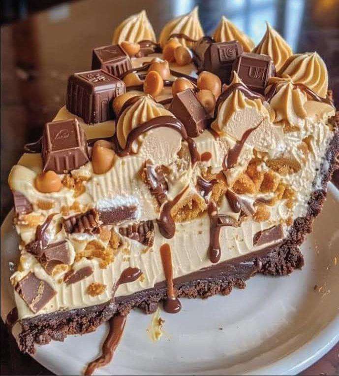 of a 9-inch springform pan to form the crust. In a large mixing bowl, beat the cream cheese and sugar together until smooth. Add the sour cream and vanilla extract and mix until well combined. Add the eggs one at a time, beating after each addition. Stir in the peanut butter until the mixture is smooth. Fold in half of the chopped Reese’s peanut butter cups into the batter. Pour the batter over the prepared crust and smooth the top. Bake the cheesecake for 55-60 minutes, or until the center is set and the edges are lightly browned. Turn off the oven and let the cheesecake cool in the oven with the door slightly open for 1 hour. Remove the cheesecake from the oven and let it cool completely at room temperature. Once cooled, refrigerate for at least 4 hours or overnight. Once ready to serve, in a small saucepan, heat the heavy cream over medium heat until it begins to simmer. Remove from heat and stir in the chocolate chips until it’s melted and smooth, stirring to combine. Let cool slightly. Drizzle the chocolate ganache over the chilled cheesecake. Top with the remaining chopped Reese’s peanut butter cups, peanut butter chips, and caramel sauce. Once sliced and plated, add whipped cream for garnish if desired.