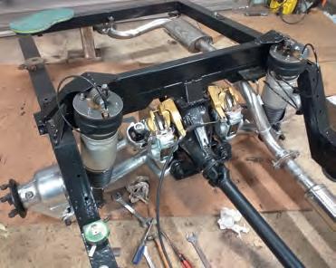 removable gearbox mount. A Sherpa van donated its front and rear axles, which were mounted using homemade bracketry front and rear, together with a Panhard rod on each to prevent lateral movement. The locating ladder bars incorporate ¾ inch rose joints and the axles have been rebuilt with new bearings and brakes.