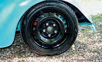 Wheels are Volkswagen T5 steelies. They’re wrapped in 195/45 Toyo