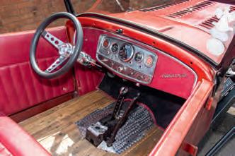 The handmade Auburn-inspired dash panel houses fuel and temp gauges, together with a GPS speedo, flanked by a pair of 105E rear pillar badges. The steering column came from a ‘60s milk float, while the eBay wheel has a centre formed from a cooking pot. The shifter housing is formed from a Smart car’s brake servo mount and the lever from an old spanner