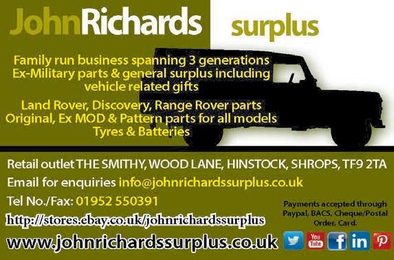 East England MPB 4x4 Independent Land Rover Specialists Parts, Repairs, Service, MOT and Breakers Unit 2, Holme Mills, Holme Mill Lane, Keighley, West Yorkshire, BD22 6BN www.mpb4x4.co.uk mpb4x4@gmail.com • 01535 661203 Phone: 01992 445634 / 01992 445630 E-mail: ajd@ajdoffroad.co.uk Unit N5, R.D. Park, Essex Road, Hoddesdon, Hertfordshire, EN11 0FB www.ajdoffroad.co.uk 2013 AWDC Comp Safari Champions using Fox Shock Absorbers AJD Off-Road John Richards Surplus Land Rover Parts, Ex-Military and General Surplus The Smithy, Wood Lane, Hinstock, Shropshire, TF9 2TA www.johnrichardssurplus.co.uk in o@ ohnrichar ssur us.co.uk • 01 03 1 www.island-4x4.co.uk Online Land Rover Part Specialists Offering Worldwide Mail Order * Free Mainland UK Delivery Over £50 * * Delivery France, Germany and Belgium £10 unlimited weight and parcels * sales@island-4x4.co.uk Foundry 4x4 Ltd Cast Iron Quality & Service The Old Bakery, Rear of Vale Terrace, Tredegar, Gwent, NP22 4HT www.foundry4x4.co.uk info@foundry4x4.co.uk • 01495 725544 STOCKIST DIRECTORY