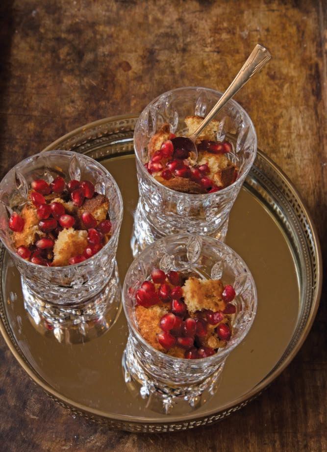 2. Add another layer of sponge chunks and drizzle it with pomegranate molasses. Sprinkle in the pomegranate arils.