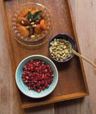 3. Add another layer of sponge and drizzle it with apricot honey syrup. Top with more pomegranate arils and toasted pine nuts.