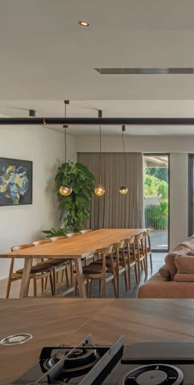 Removing a partition wall opened up the kitchen, dining, and living area. The indoor dining table and chairs from camilleriparismode and light fittings by Elektra complement the sleek design aesthetic.
