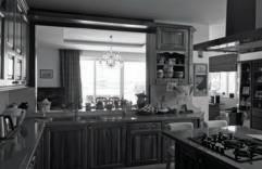 What was formerly an L-shaped kitchen, living, and dining area has been remodelled to create one large open space where functional boundaries are defined by the furniture layout rather than by physical partitions. “We removed a partition wall to create the open space. A beam that replaced the load-bearing wall is concealed inside the soffit, along with the mechanical and electrical infrastructure that support the air conditioning and lighting. Down at floor level, the architects created a long, monumental kitchen island in a striking dark brown marble veined in turquoise.