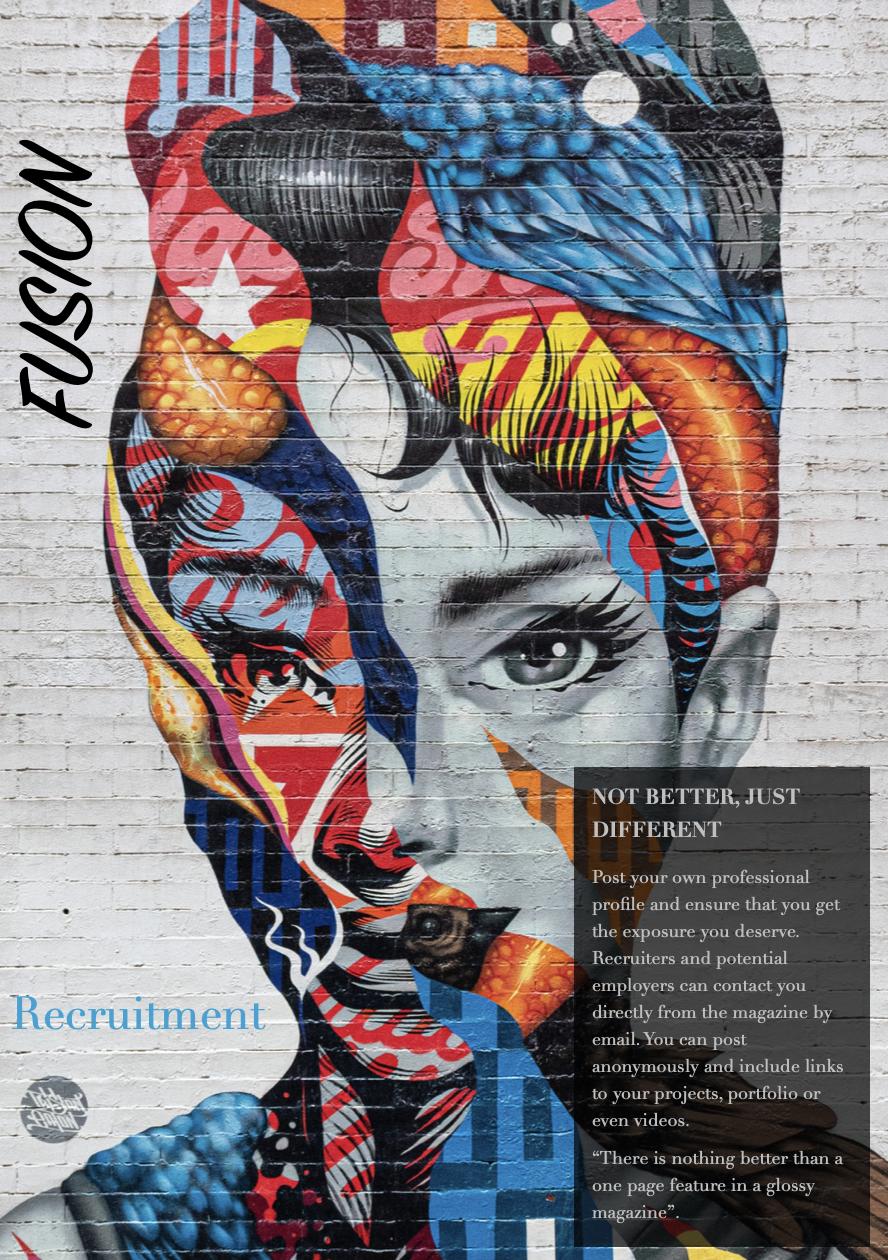 This section is called fusion, and it's for people who want to do things a little bit differently. You can advertise your details in a one or two-page spread. Design precisely how you want to be seen with active links to a portfolio or slide show.