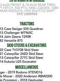 1986 Versatile7564wdTractor •Steiger280 Cougar4wdTractor •JohnDeere 46302wdTractor •Ford1920 Tractor •MinneapolisMolineM6702wdTractor •SECQ/C60inHydTiltExcavatorBucket• AlliedBuhler795 FrontEndLoader•3pt BaleSpear •Wolverine48inMiniSkidSteerAngleBroomw/Remote•Loftiness36030ftFlailMower• TillerSkidsteerAttachment •Skid-steerMower(Unused) HARVEST,SEEDING,TILLAGE,TILLAGE,SPRAYING,HAYING &LIVESTOCKEQUIPMENT