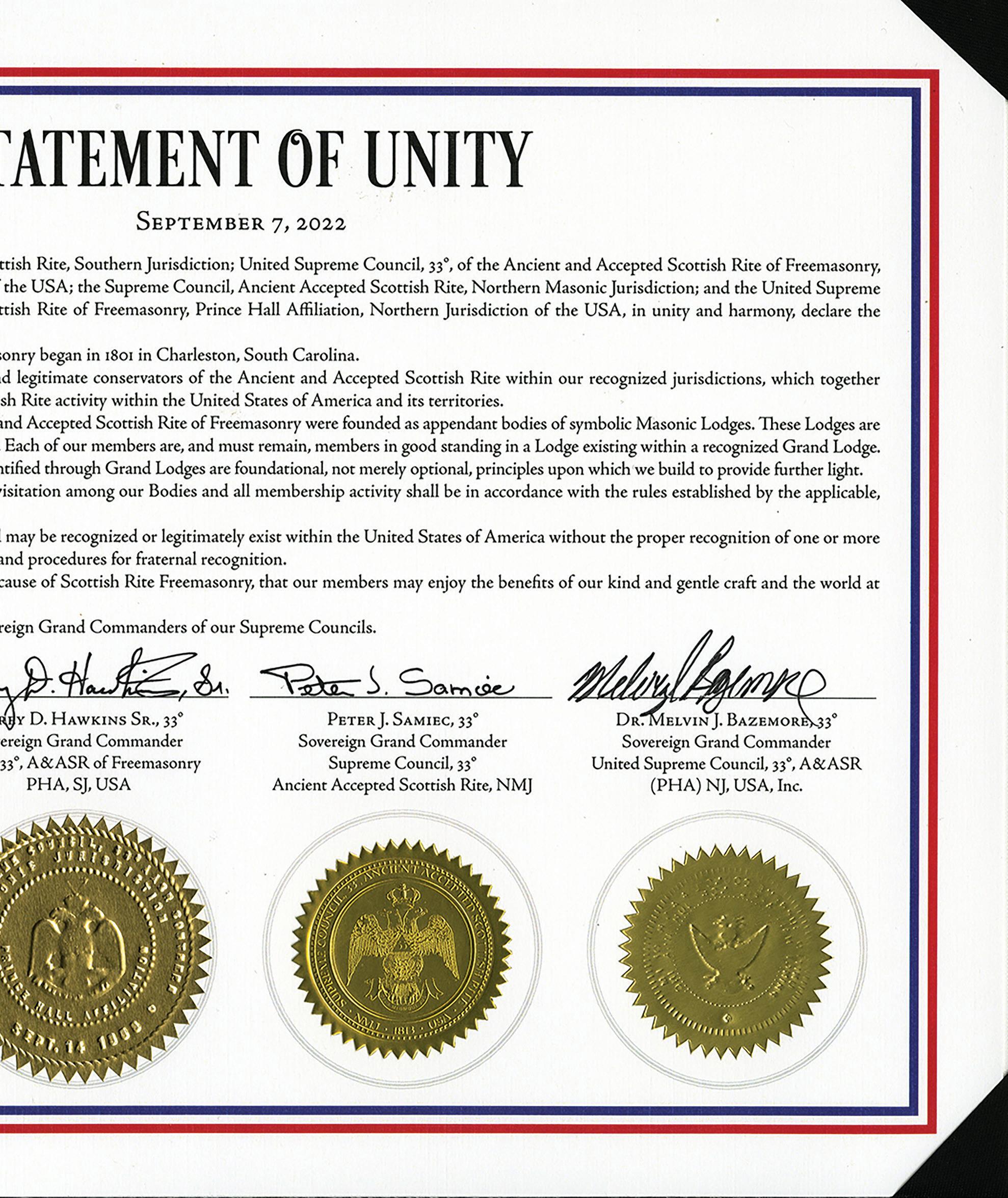 In September, all four Sovereign Grand Commanders gathered at the House of the Temple in Washington, D.C., to sign a Statement of Unity. In so doing, they recognized each other as the only legitimate Supreme Councils in the United States, affirmed their roles as appendant bodies under the umbrella of symbolic Freemasonry, and pledged to support one another in the cause of the Ancient Accepted Scottish Rite: Unity of Purpose.