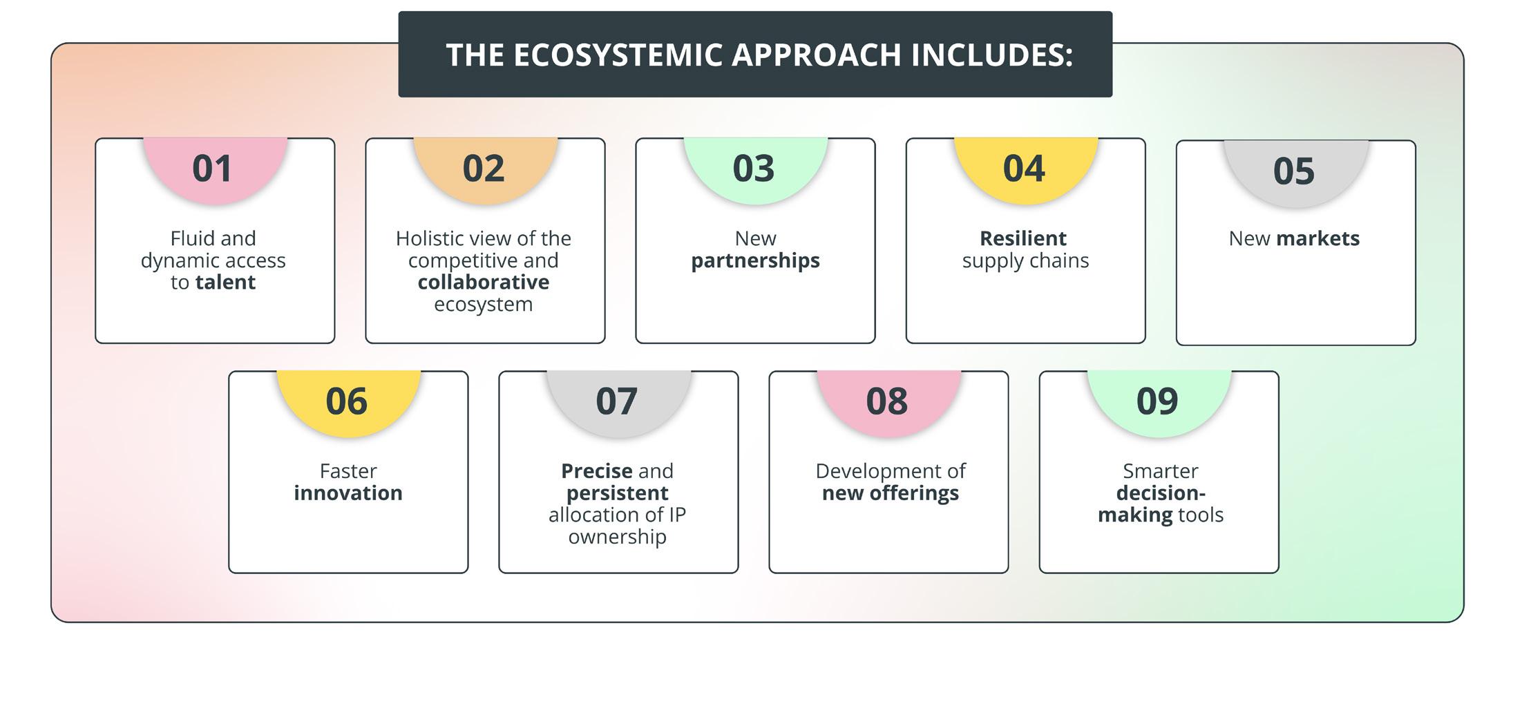 Recent studies underscore the importance and benefits of ecosystems. For instance, PwC highlights that companies within ecosystems exhibit greater speed, flexibility, and innovation. The World Economic Forum emphasizes the critical role of partnerships in