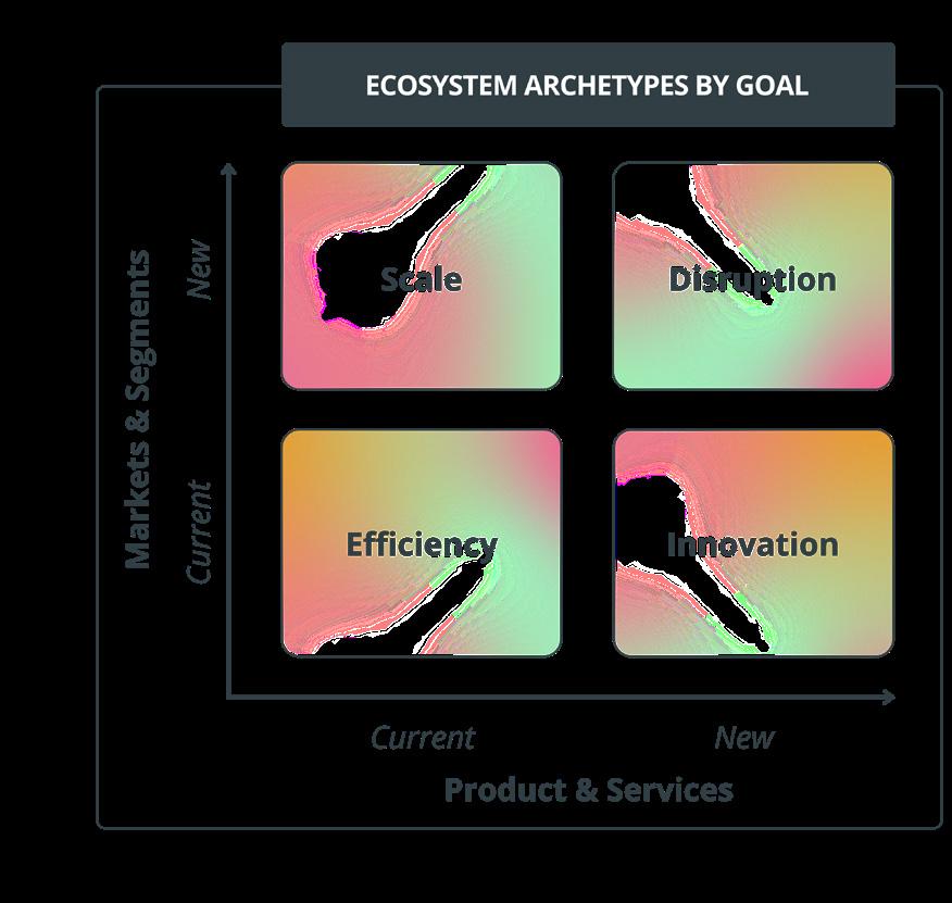 A simple archetype structure can help to understand the company’s purpose with the ecosystem beyond the end consumer value proposition. This can ease prioritisation, decision making and leveraging learnings from others, while it is important to acknowledge that a single ecosystem can serve multiple purposes, and companies often participate in multiple ecosystems simultaneously. As archetypes, ecosystems can be categorised based on their goal as follows:
