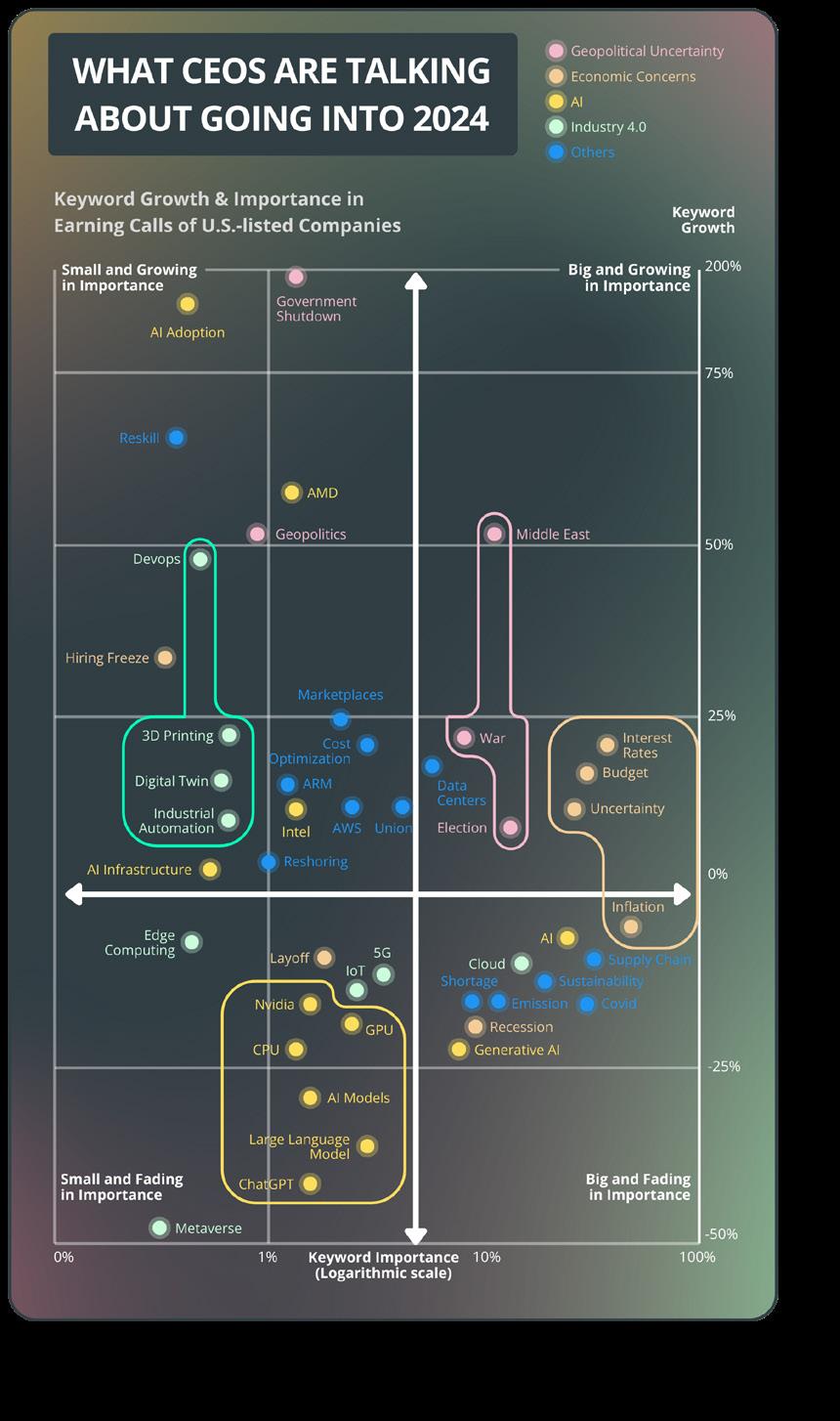 Going into 2024, several business topics were growing in importance for CEOs and business leaders. Industry 4.0 technologies like digital twins and industrial automation are crucial for enhancing operational efficiency. Conversely, some areas such as generative AI and certain sustainability practices might see a shift in focus. Yet, the importance of data centers and digital infrastructure is growing, underlining the need for businesses to adapt to these changes swiftly.