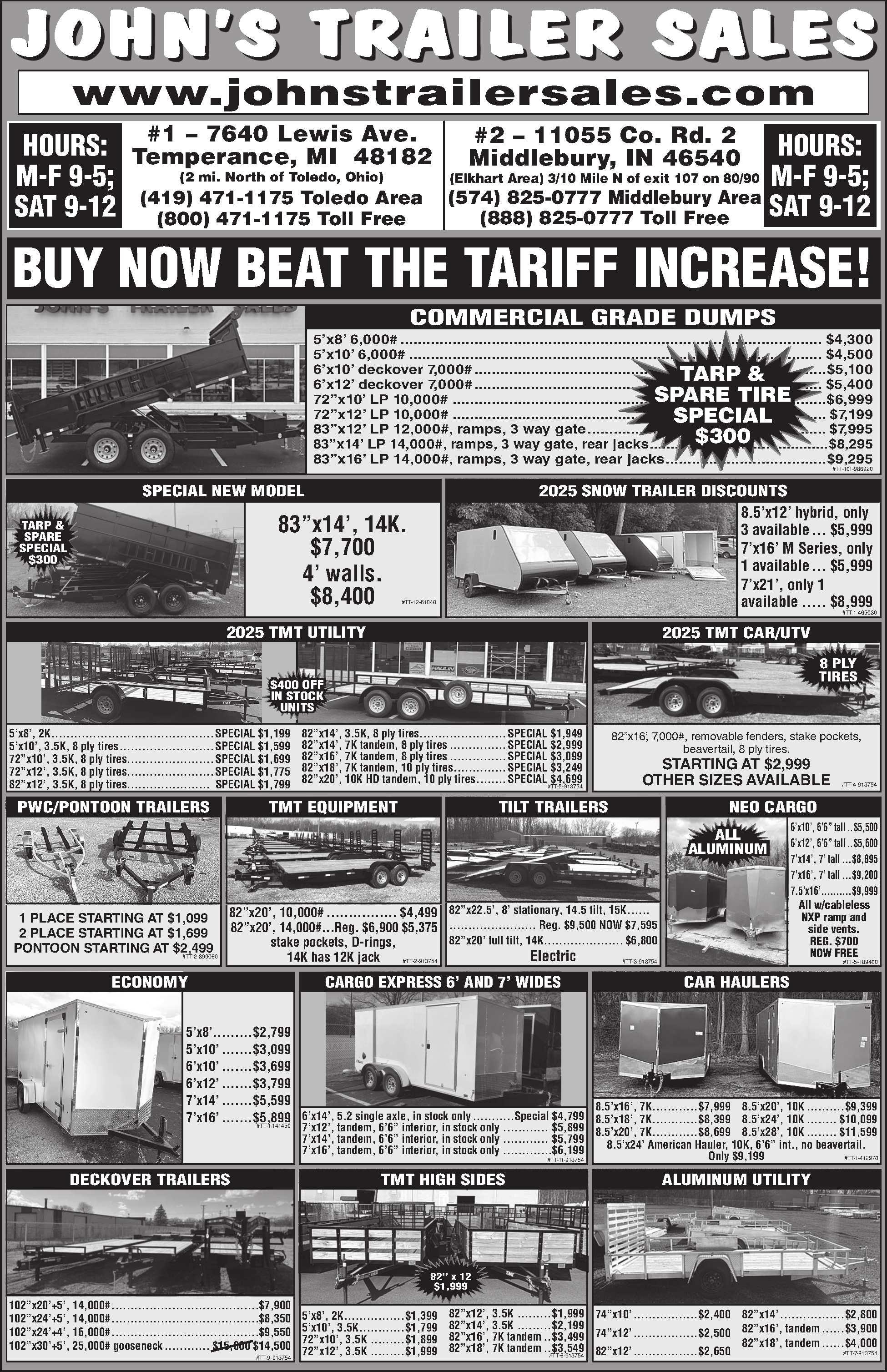 2025CORNPROSTOCK. 6’x16’,6’6”high, 2-3500#torsionaxles,15”6lug,10plyradials, insideandrearslidergates.$8,650.Othermodels onourlot.ZahmTrailerSales,Inc.,Huntington,IN. zahmtrailersales.com,260-356-8322M-F9-5 494190