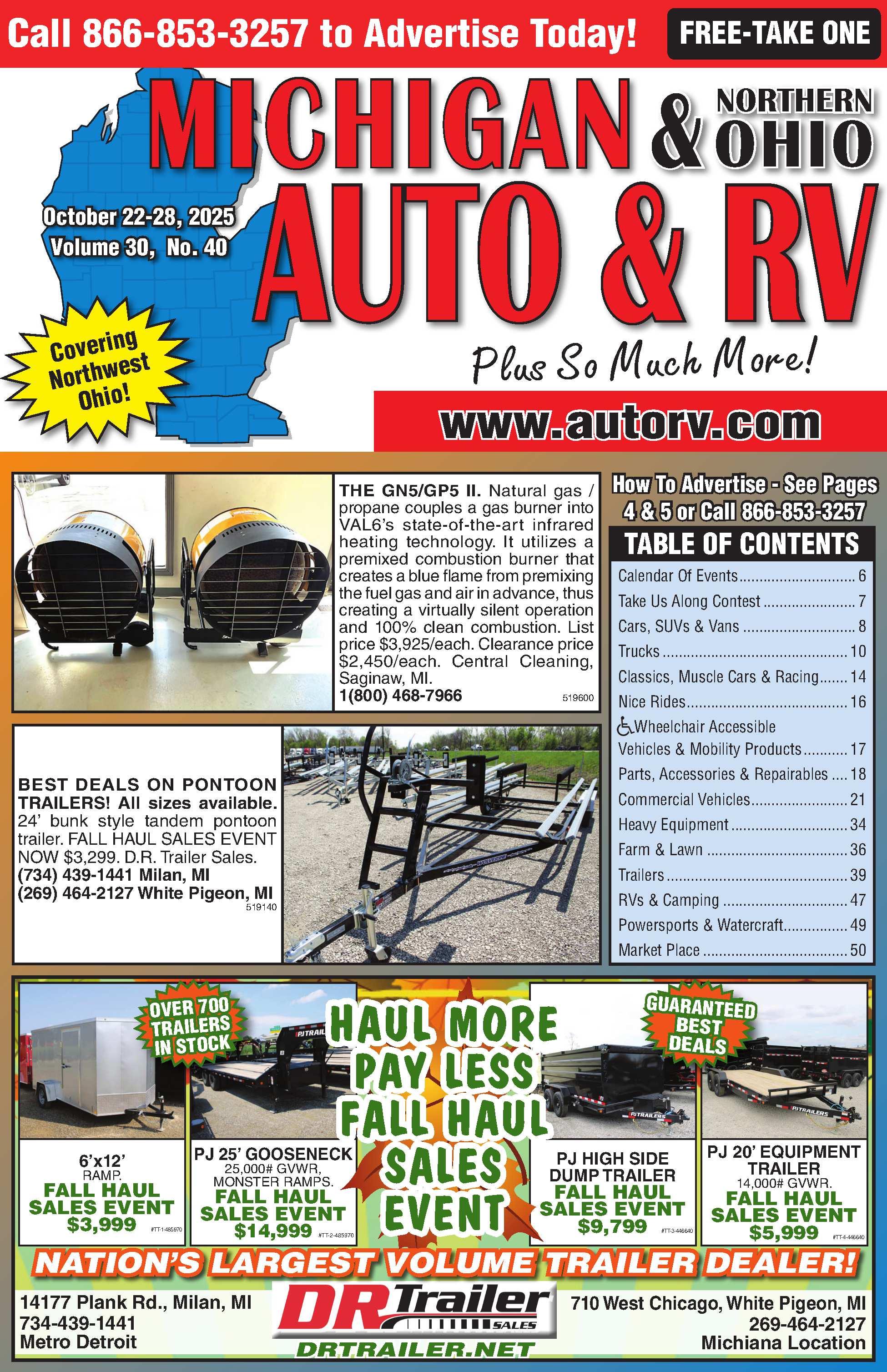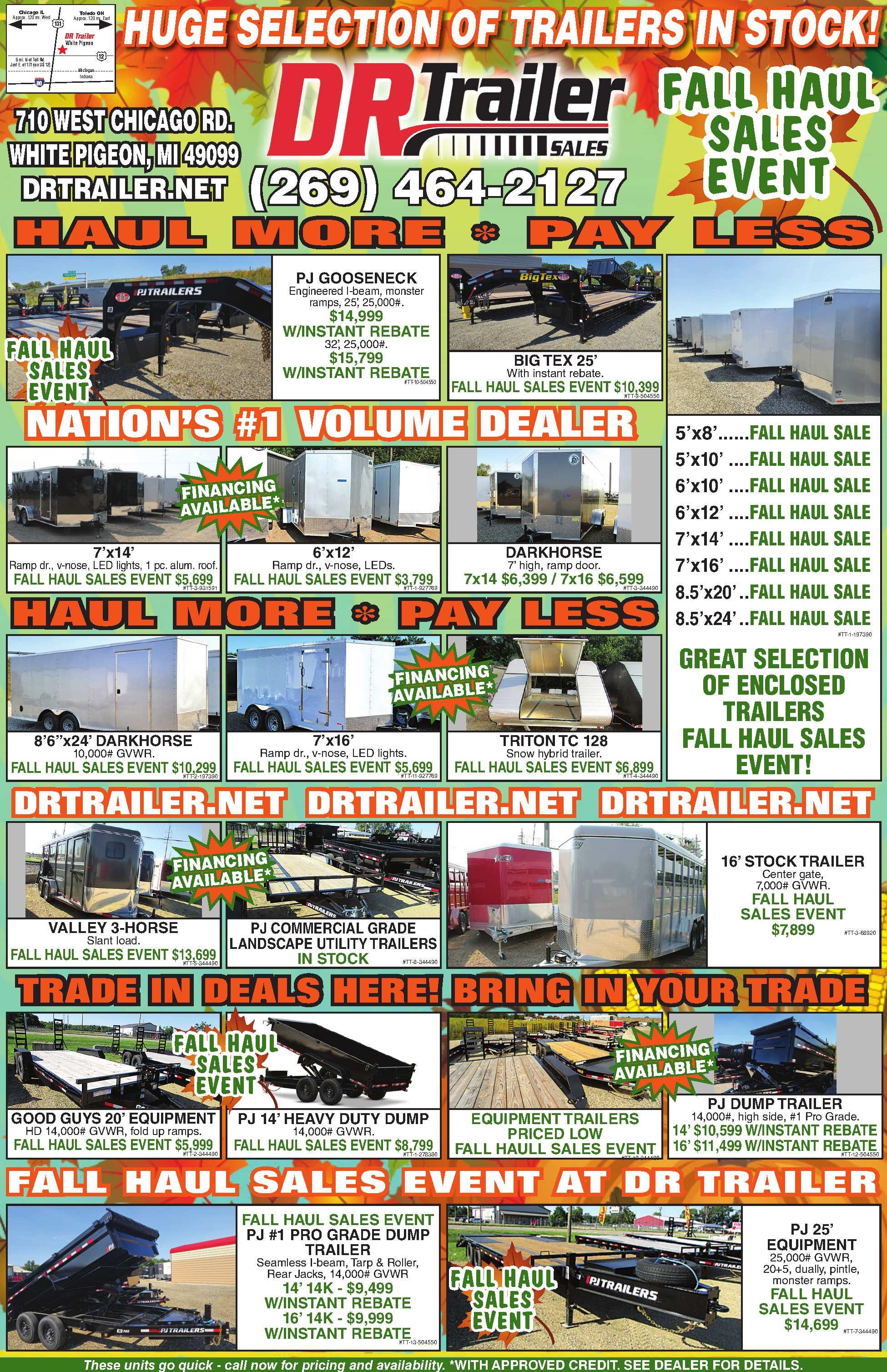 BESTDEALSONPONTOON TRAILERS! Allsizesavailable.24’bunk styletandempontoontrailer.FALLHAUL SALESEVENTNOW$3,299.D.R.Trailer Sales. 734-439-1441Milan,MI 269-464-2127WhitePigeon,MI 519140