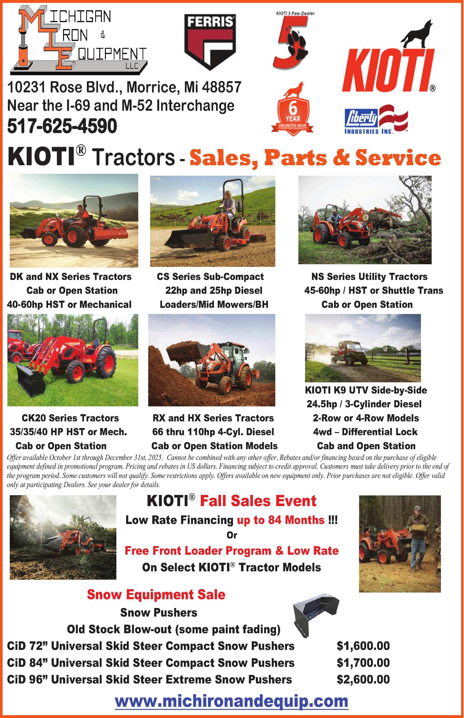 KIOTITRACTORS-CAB&HEAT-21-91HP. INSTOCKWITH6YEARUNLIMITED HOURWARRANTY.(Non-commercial),0%-$5,000cash.Selectmodels.Callforcash price.Callforwarrantydetails.AeschlimanEquipment(established1971),US23,Exit50 (justN.ofAnnArbor),WhitmoreLake,MI. 734-994-6000,www.aeschliman.com