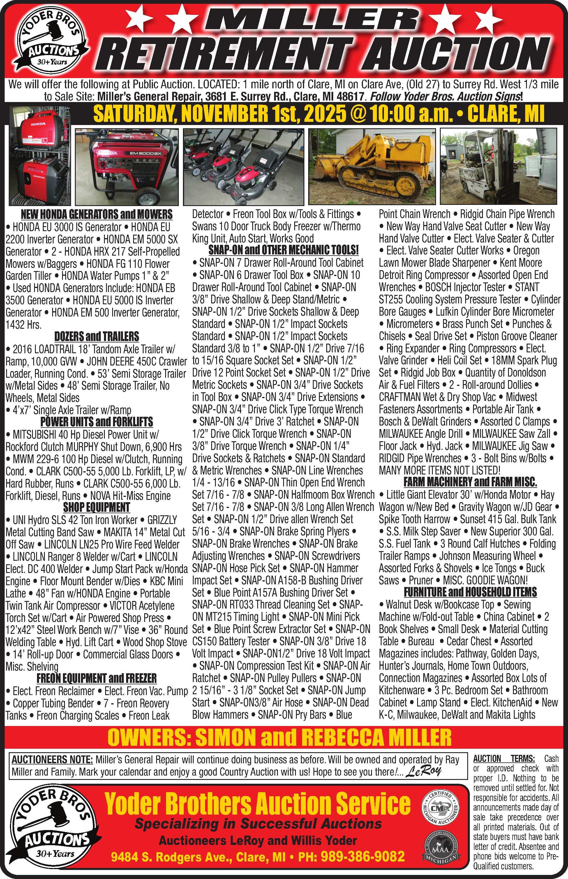 NEWHONDAEU2200iGENERATORS. Superquiet,lightweight,only46 lbs.dryweight,9hourson1.1gal.gas,3 yearwarranty.Callforpricing!Weservice whatwesell.Miller’sGeneralRepair,Clare, MI. 989-386-7564