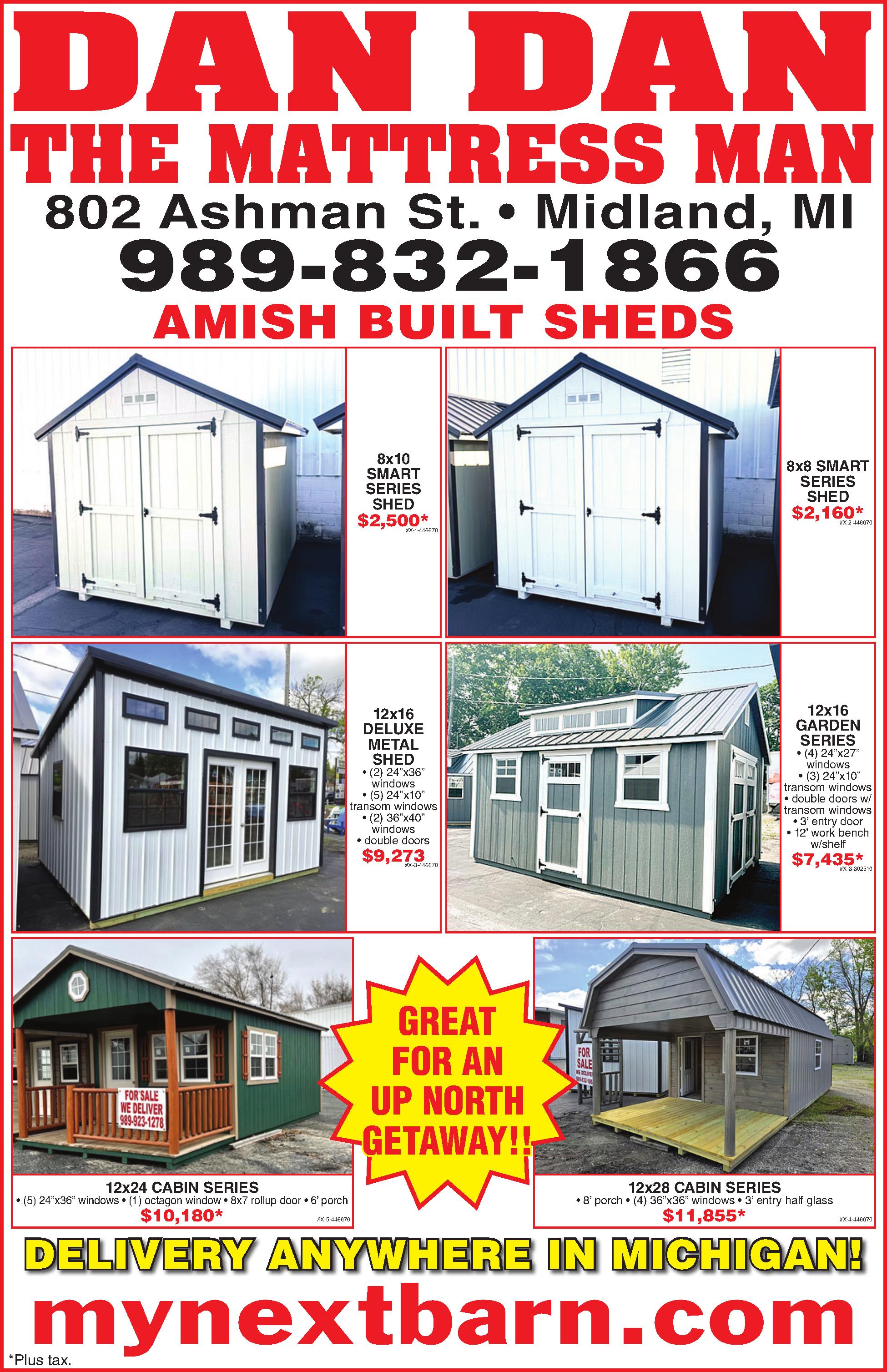 8x10STORAGESERIES. Amish built.$2,680.CallfordeliveryanywhereinMichigan.Midland,MI. www.mynextbarn.com 989-832-1866