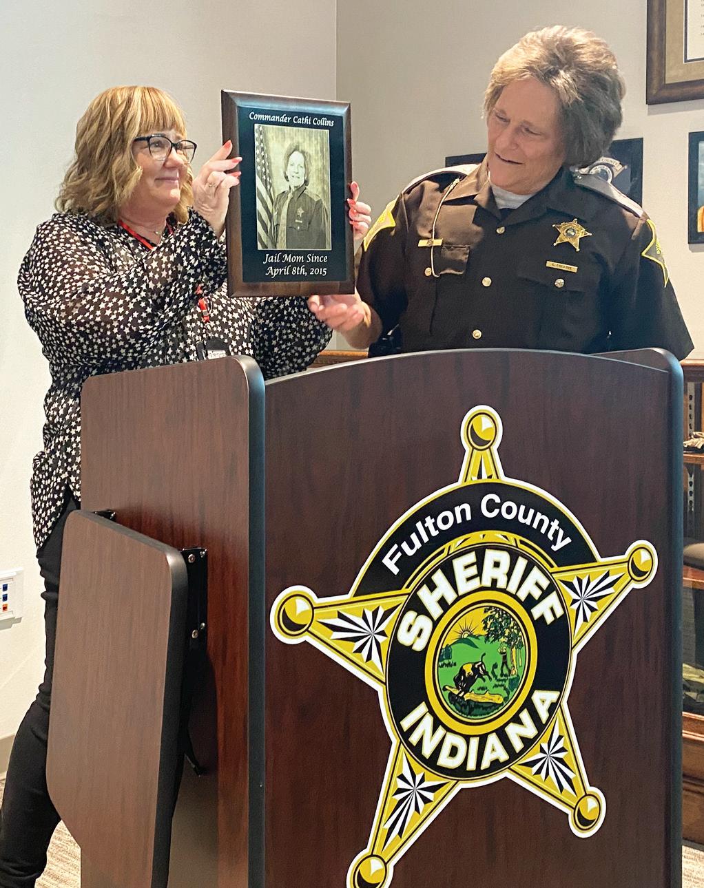JAIL MOM Cathi Collins has served as Fulton County’s jail commander for 10 years. Here, Debbie Fernandez, left, one of the Fulton County Jail Chemical Addiction Program’s coordinators, gives Collins a plaque, which notes Collins is a jail mom, thanking her for her support of JCAP. Photo by Leah Sander.