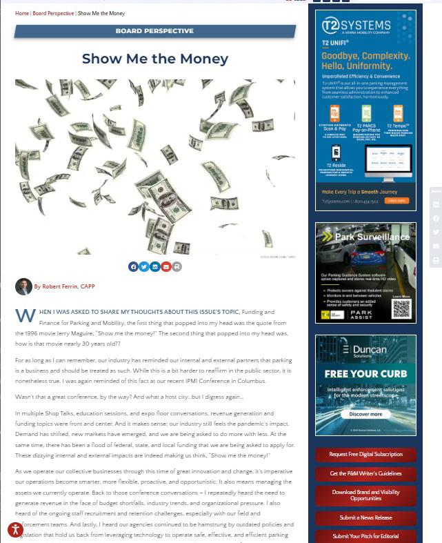IPMI’s digital platform is the online home of Parking & Mobility magazine’s content, as well as fresh articles published each week. Readers are driven to this platform through dedicated email campaigns, a bi-monthly issue launch campaign, as well as multiple social media posts weekly. Want to get your message in front of our community? Don’t miss this resource to amplify your messaging.