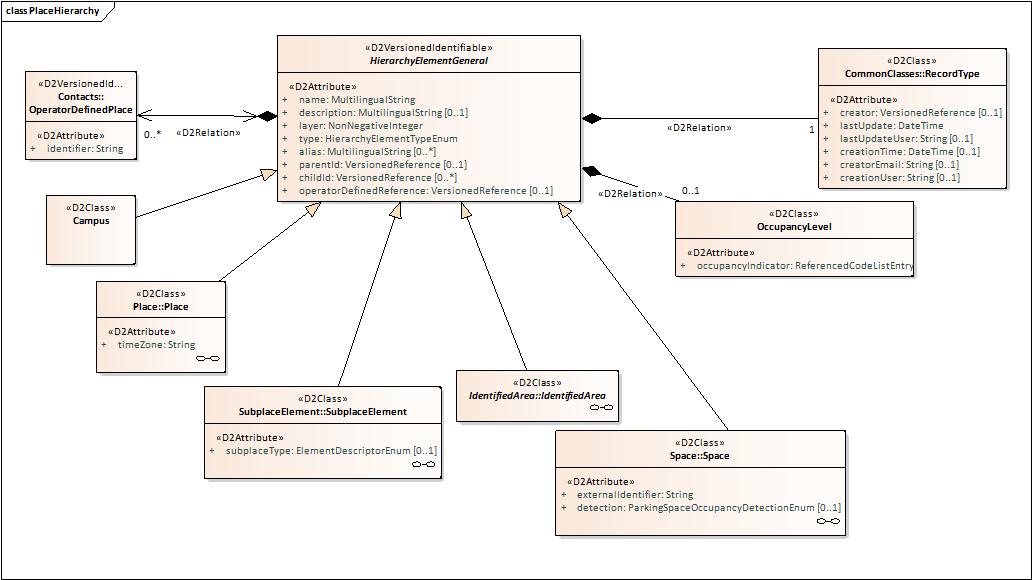 Place is a core component of this model as it defines a hierarchy that supports the identification of portions of locations that may be related to parking and other types of operations. Use of this hierarchy enables data suppliers to provide a structured mechanism to refer to related zonal and place concepts with an ordered hierarchy.