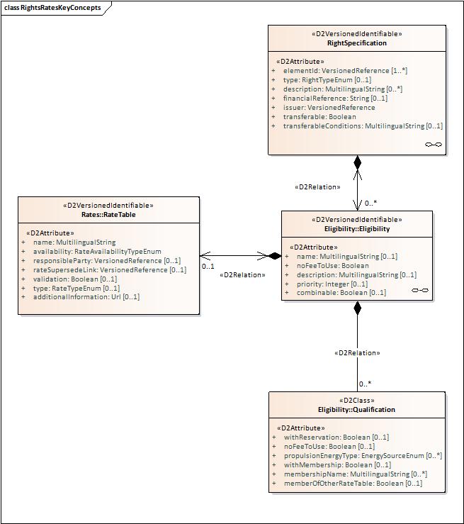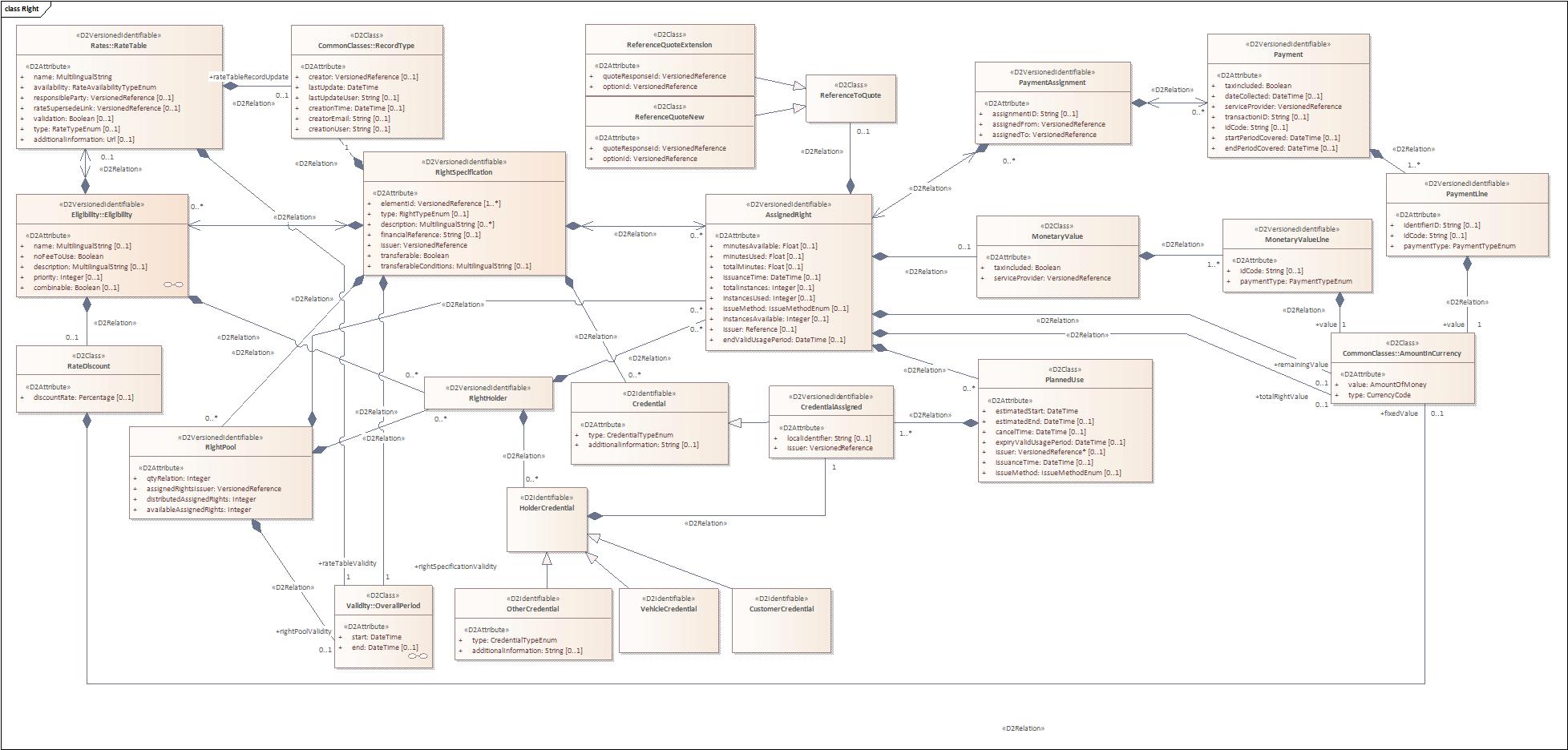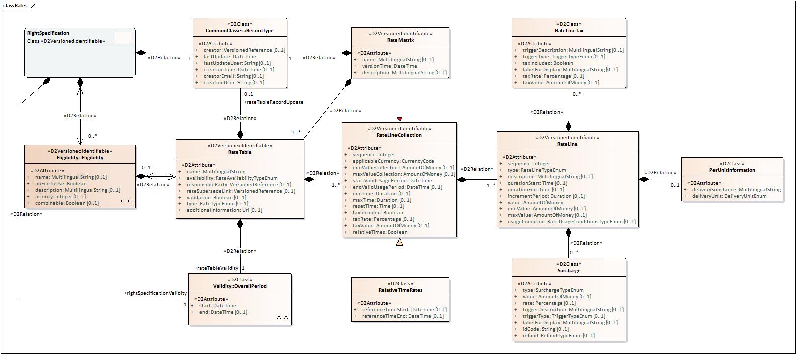 Figure 58 shows a UML class diagram for Times data concepts, and Figure 59 shows Validity date concepts. Figure 60 shows the relationship between Validity, Rates, and RightSpecification.