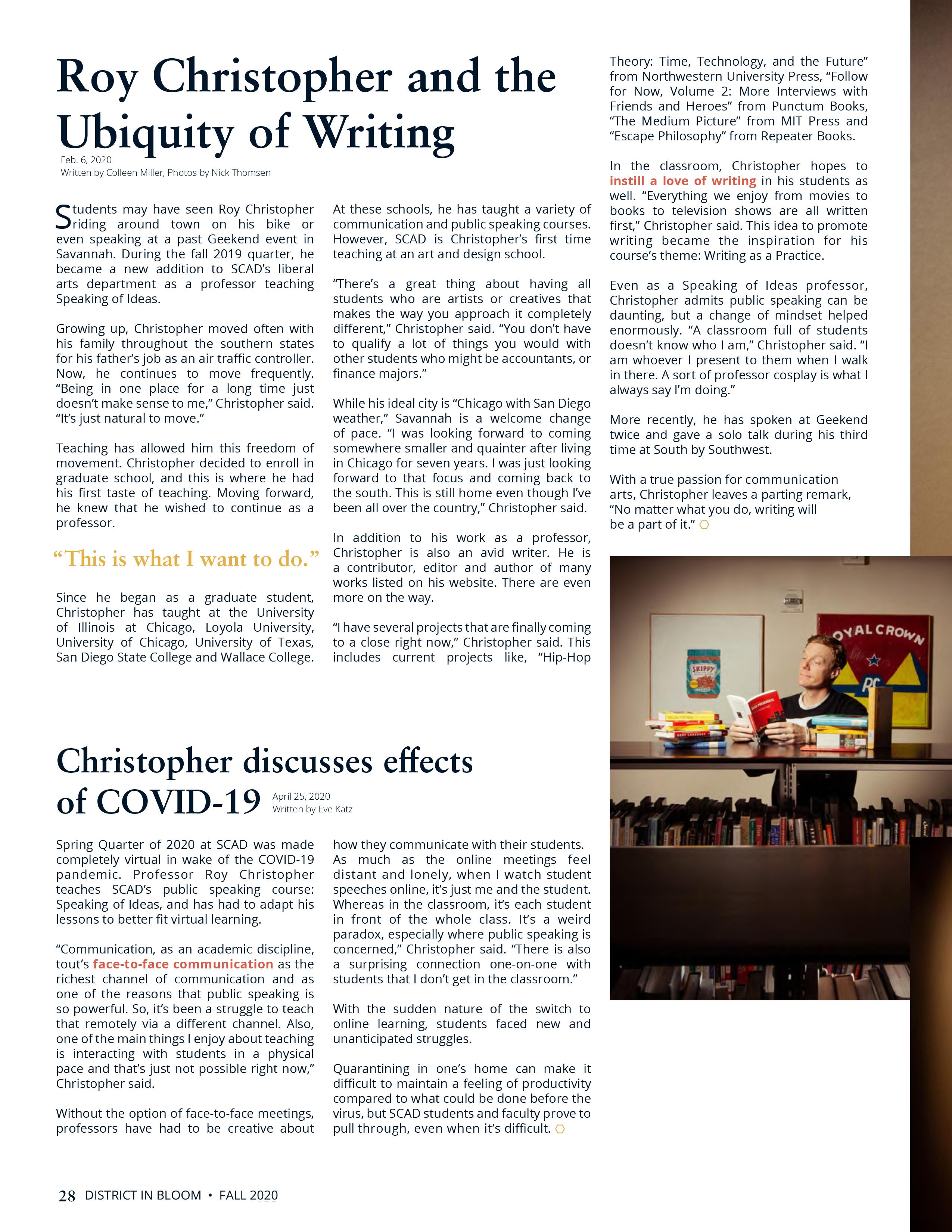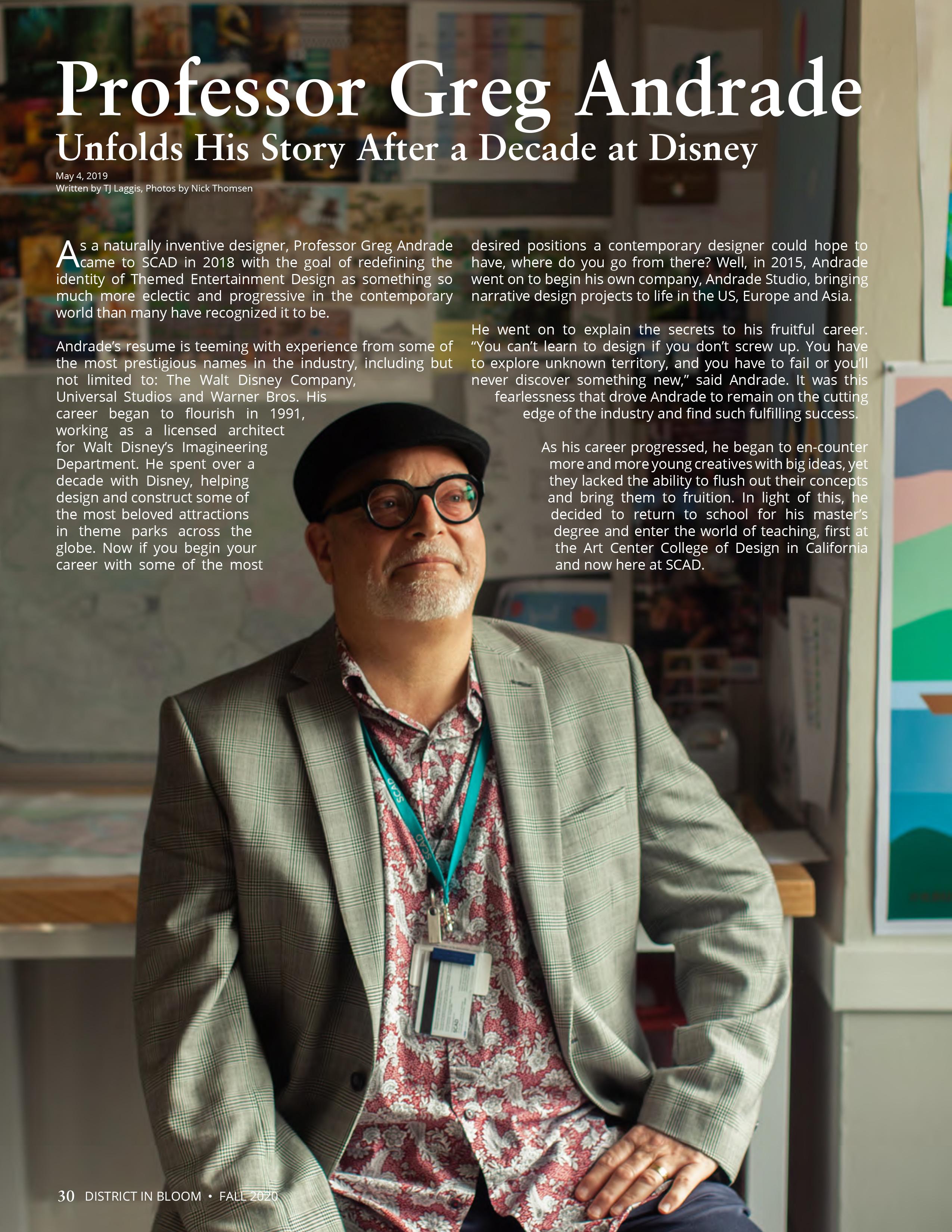 27 Taking on a Quarter in Quarantine, Together Colleen Miller, Nick Thomsen 28 Roy Christopher and the Ubiquity of Writing Colleen Miller, Nick Thomsen 28 Christopher Discusses Efects of COVID-19 Colleen Miller, Nick Thomsen 30 Professor Greg Andrade Unfolds His Story After a Decade at Disney TJ Laggis, Nick Thomsen