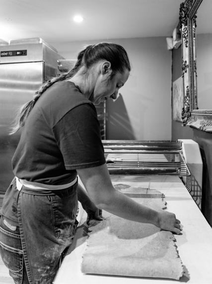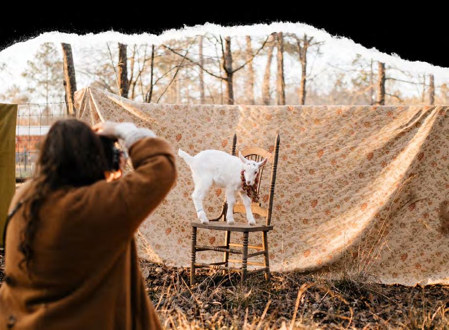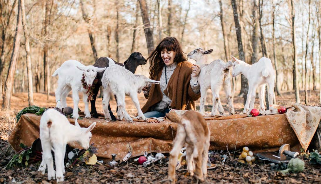 end, embellishing the surface with flower petals, pinecones and clay mushrooms. And then the goats ... so the platters came crashing — not to mention the bleating echoing from ear to ear at the sight of a marvelous dinner. Medieval music flowed from a distant cell phone speaker while Rosen captured the fantastical feast behind a Fuji camera. From “posed” portraits before a handmade rug to chewed up tripods and tablecloths, these baby goats contributed to an afternoon of passion without the pressure. “Be consistently flling your well,” Rosen said.