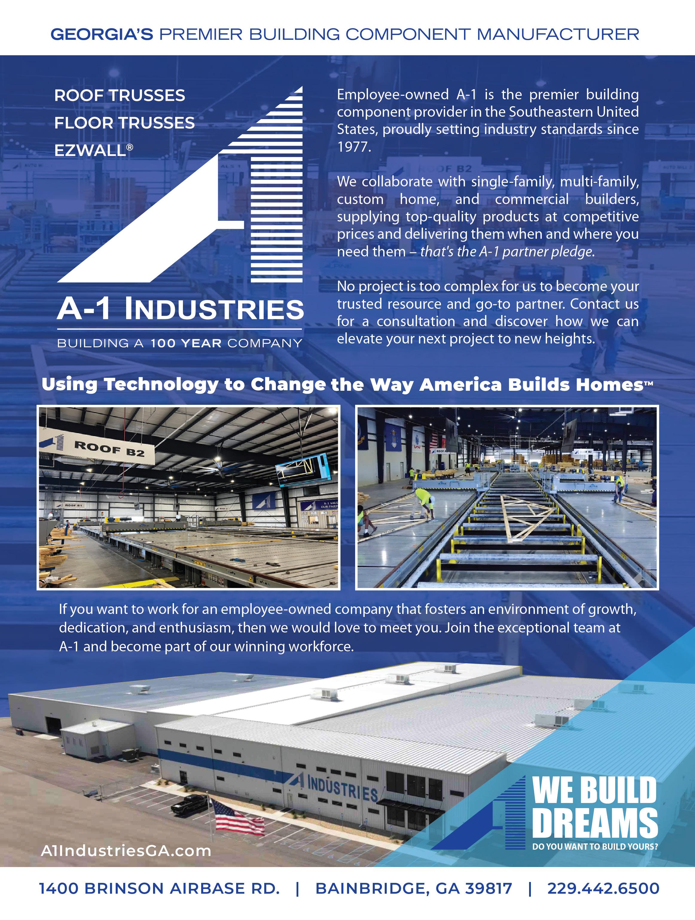 A-1 is a leading manufacturer of pre–engineered wood trusses and EZWALL® framing solutions. With over 370 employees, the company operates manufacturing facilities in Fort Pierce, Fla., and Bainbridge, Ga. A-1 prides itself on its commitment to its core values, which include "Own it, Passionate, Honesty, and Respect." These values serve as guiding principles.