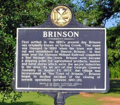 Brinson is on the A.C.L. railway 10 miles west of Bainbridge, on Spring Creek, the most beautiful little stream of clear water to be found anywhere. It has a population of about 500. It has the largest sawmill in the county. A number of mercantile houses