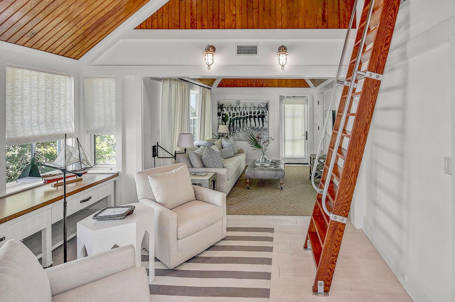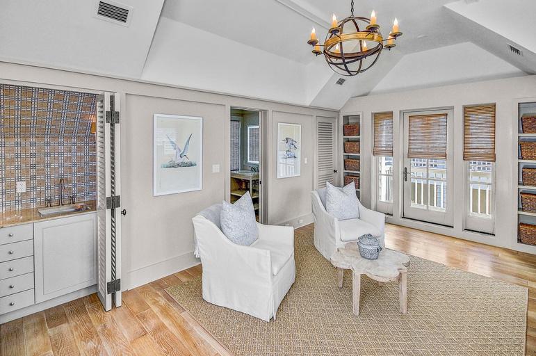 The residence consists of 4280 square feet of flowing and easy living, 3200 square feet of deep porches, balconies, and breezeways, and includes 4 bedrooms, 4 full baths, and 2 half baths, plus additional built-in bunks and sleeping areas. Other features include a second-floor gulf-front primary bedroom suite filled with light illuminating through the expansive Palladian windows providing views of the Gulf of Mexico, lush landscape, boardwalks, and the Dunesider pool; an elevator from the 1st floor to the 2nd floor; a 3rd floor tower room with built-in bar; a hidden secret storage room; a spacious carriage house attached by an outdoor deck; and a two-car garage.