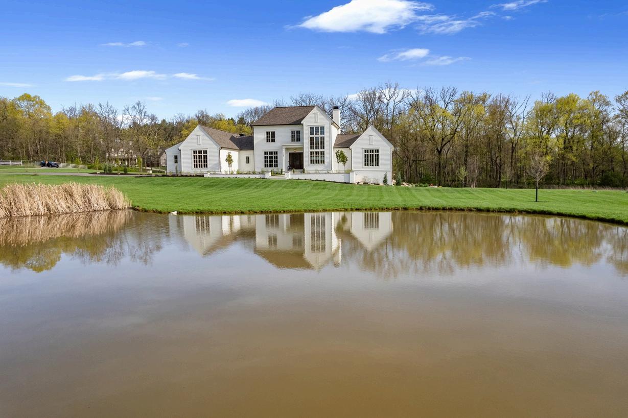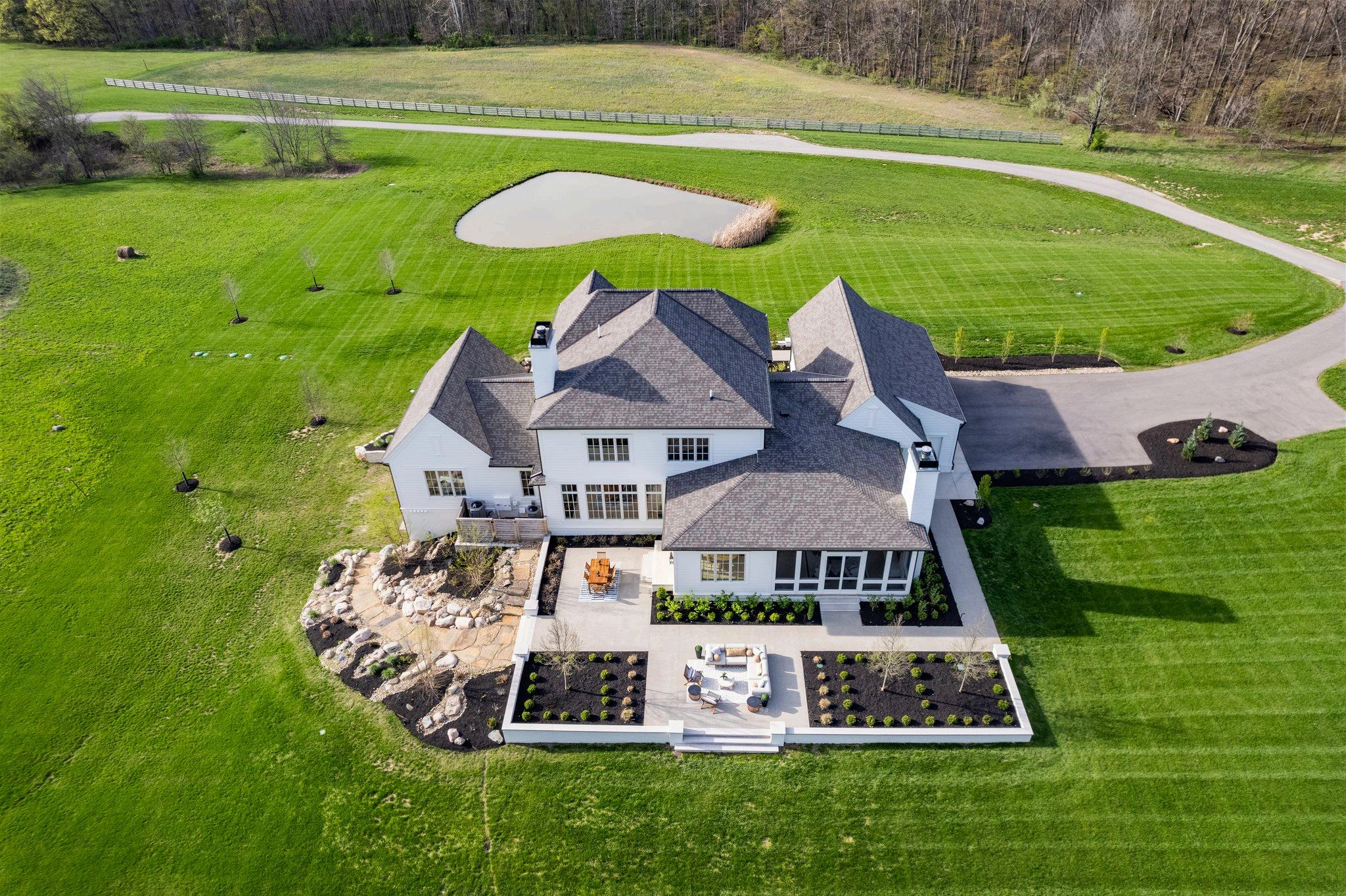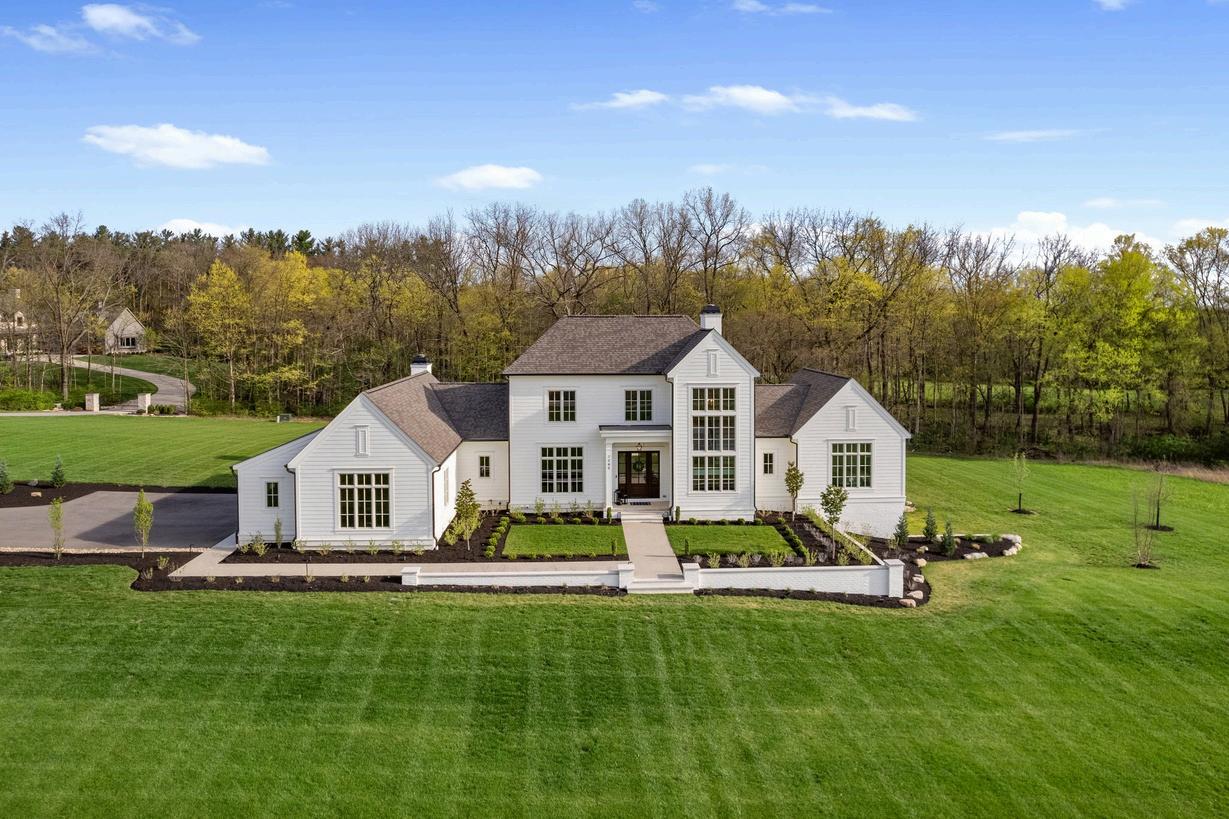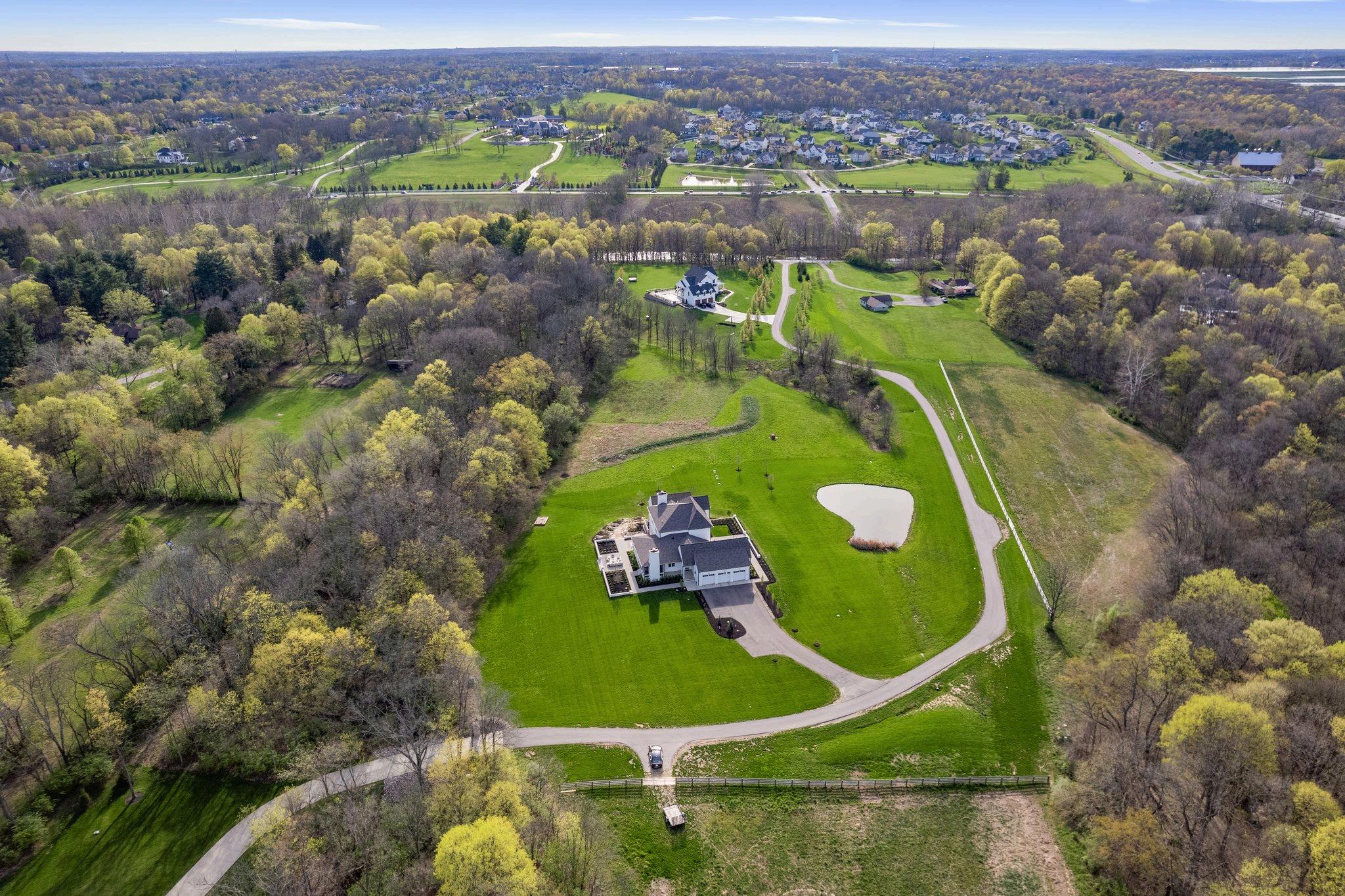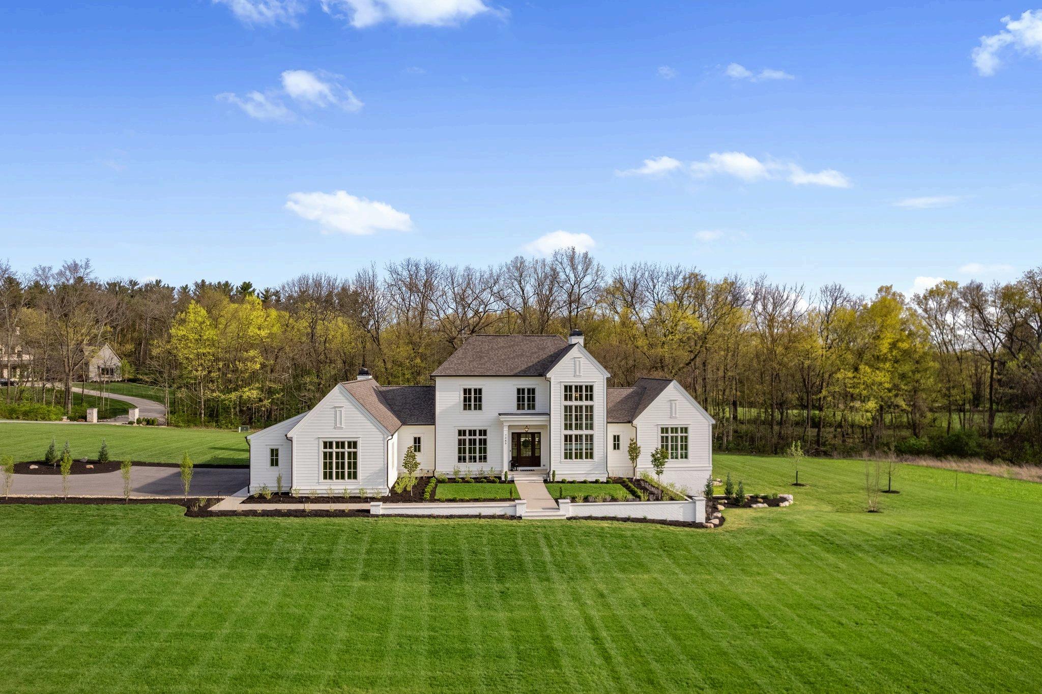 Nestled on a sprawling 77-acre secluded estate, this custom-built home completed in 2023 by The Bellepoint Company exudes luxury, privacy, and unmatched craftsmanship. Located within the Olentangy School district, the residence showcases stunning white oak floors, Amish-built custom cabinetry, elegant marble tilework, timeless design elements and finishes throughout. The gourmet kitchen is a chef’s dream, featuring built-in paneled appliances: 8-burner ILVE gas range, a double Thermador refrigerator, and two KitchenAid dishwashers. A spacious butler’s pantry, doubling as a fully functional second kitchen, adds both convenience and functionality. The kitchen seamlessly opens into the great room, which boasts floor-to-ceiling windows, custom built-ins, and a striking limestone woodburning fireplace The first floor includes a dedicated den and an owner's suite with a soaring two-story cathedral ceiling, double vanity and exquisite marble tilework. Upstairs, the second floor offers three bedrooms, two full baths, and a loft area with views of the wrought iron & oak staircase open to the basement. The walk-out lower level is thoughtfully designed with LVT floors, featuring a home gym, a fifth bedroom, a full bath, and a recreation room Enjoy the peaceful surroundings from the screen porch or one of the two inviting patios perfect for outdoor entertaining.