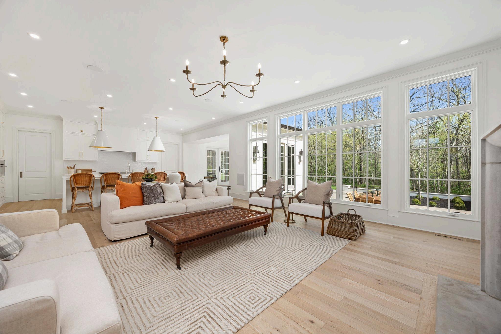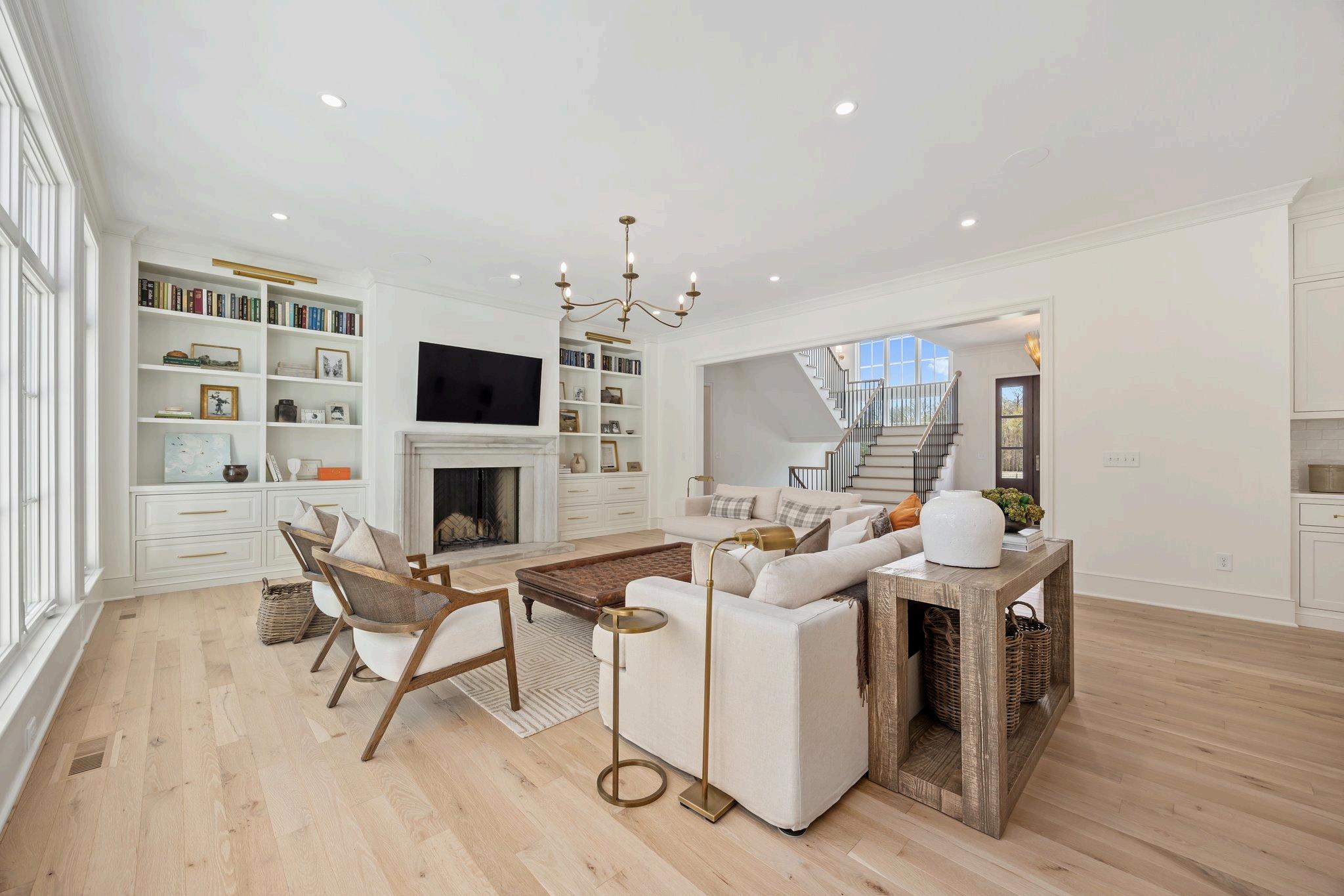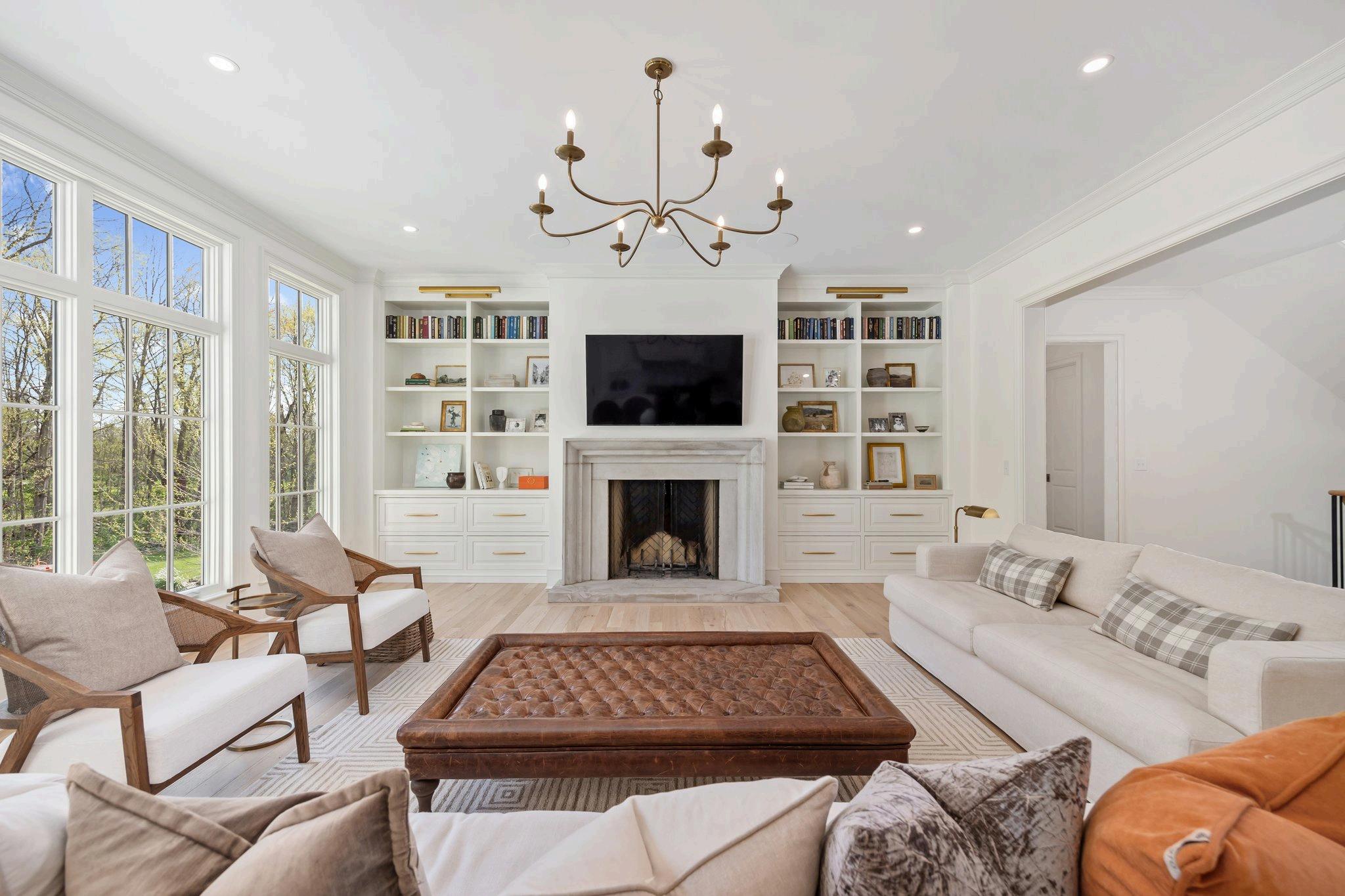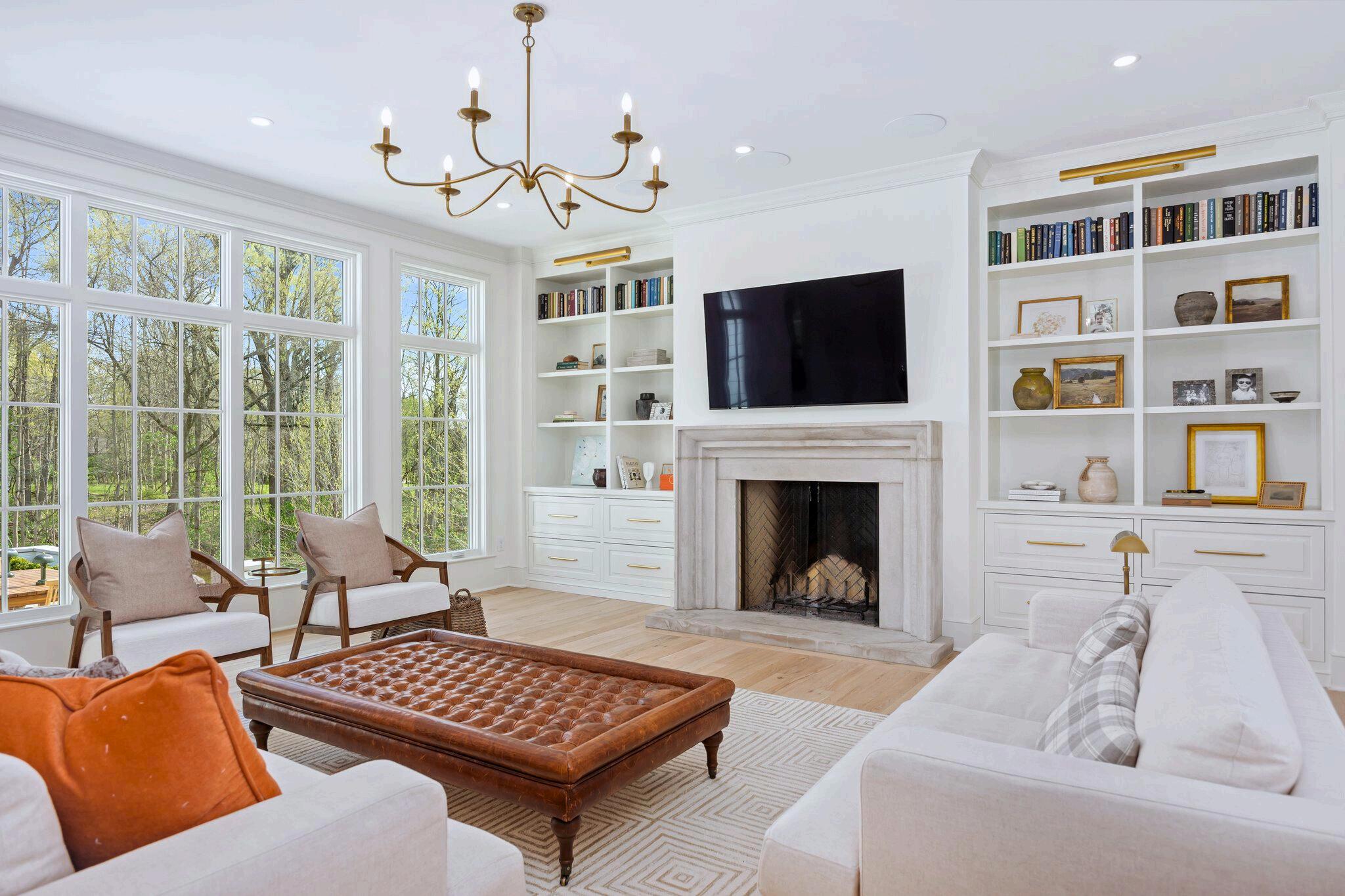 In the heart of the Great Room, a striking limestone wood-burning fireplace steals the show. Flanked by custom built-ins that blend beauty and function, all framed by floor-to-ceiling windows that bring in amazing natural light.