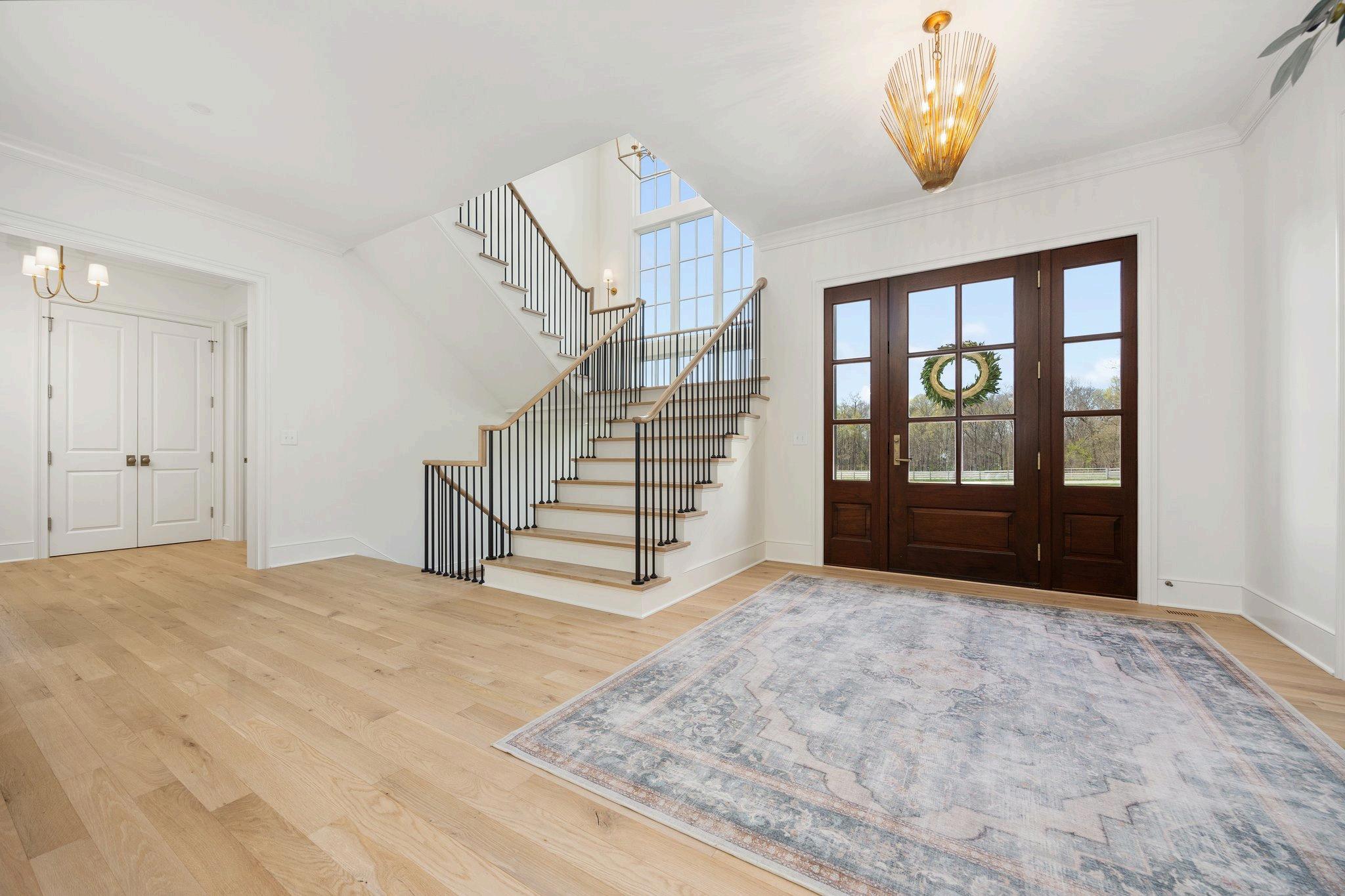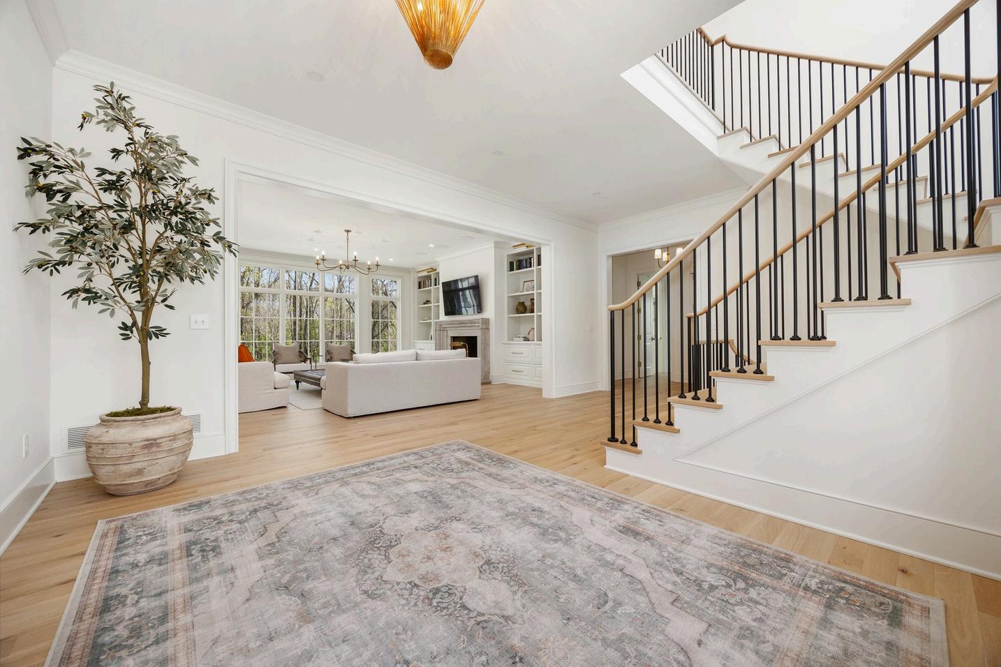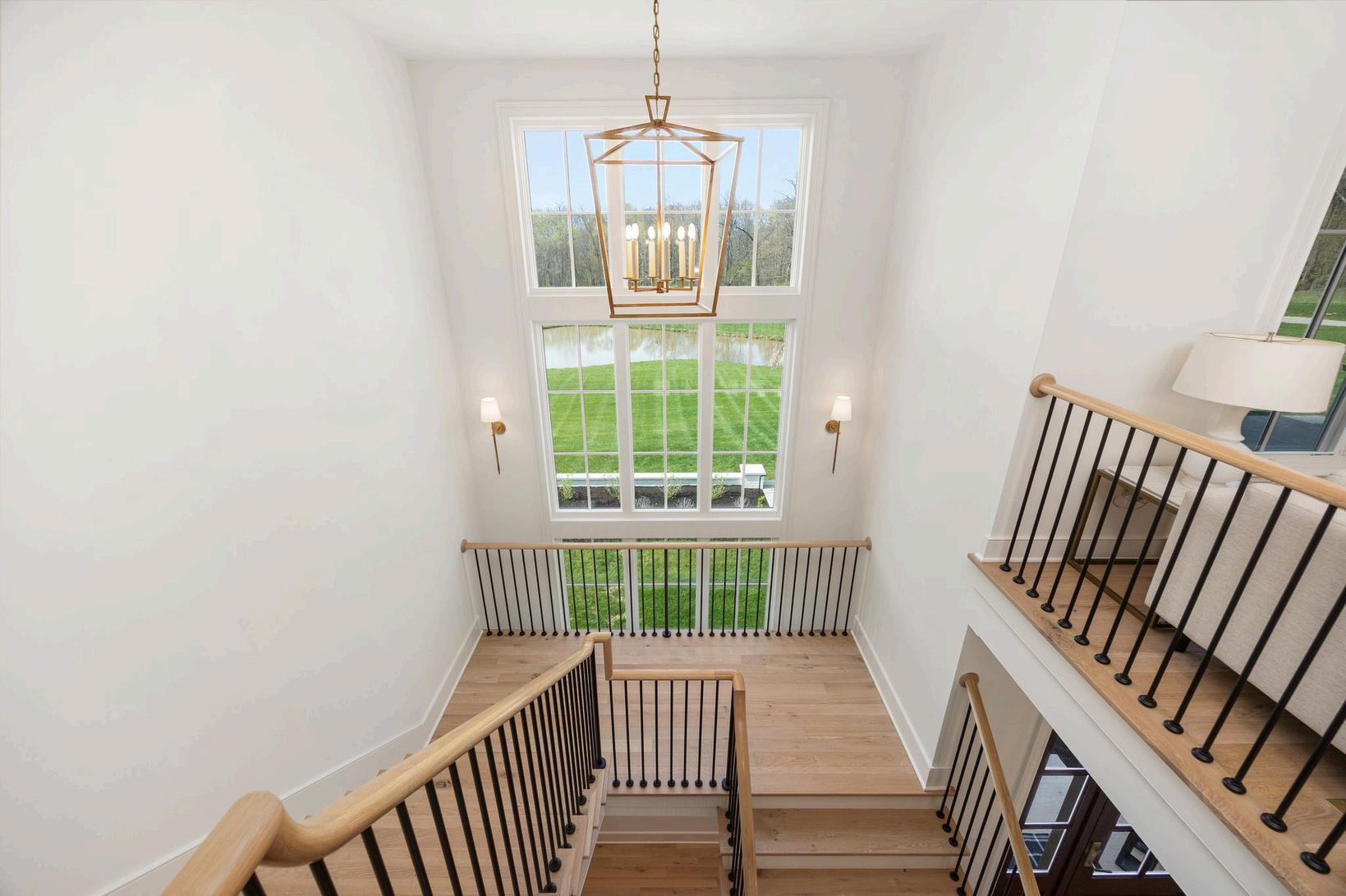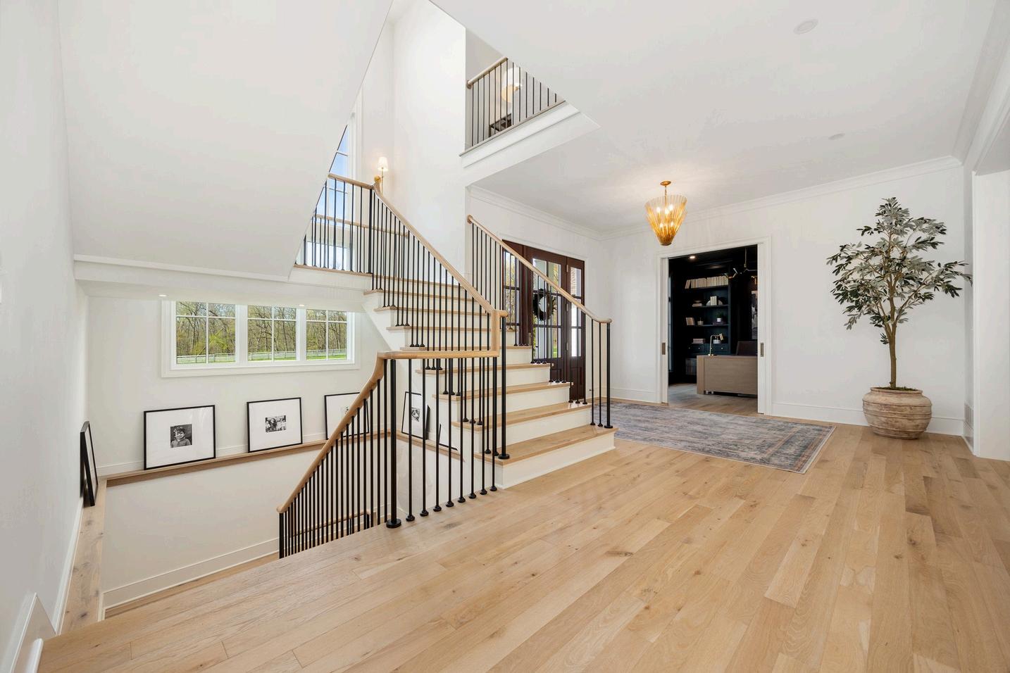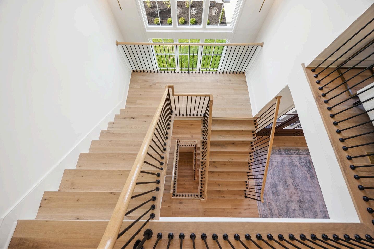 White oak floors lead the way to a striking wrought iron and oak staircase open to the basement, and crafted with exceptional detail.