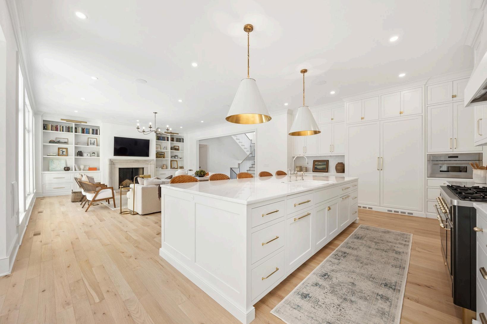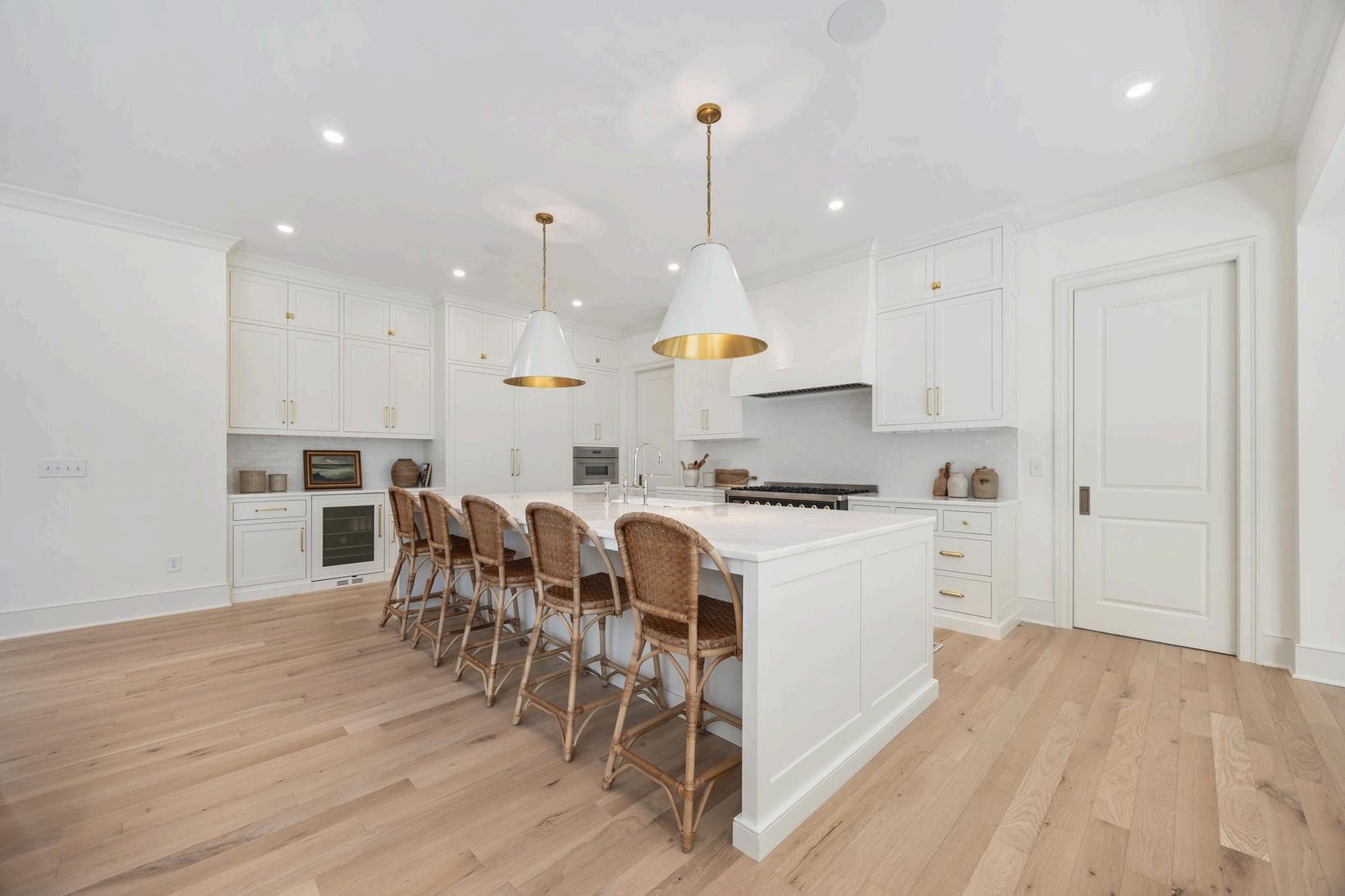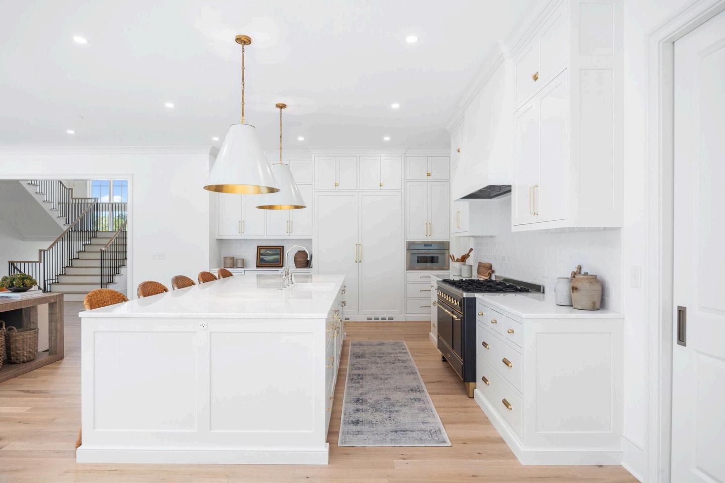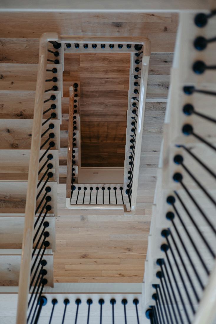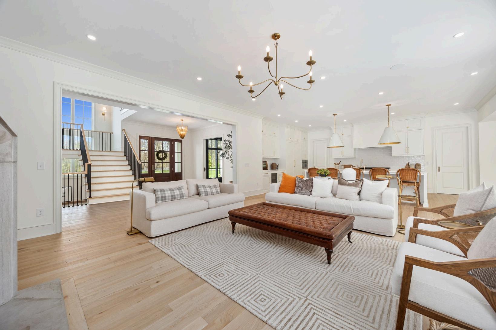 White oak floors lead the way to a striking wrought iron and oak staircase open to the basement, and crafted with exceptional detail.