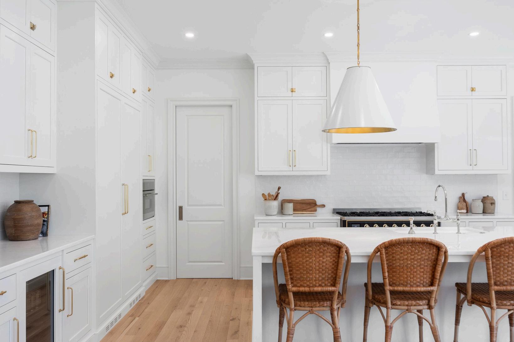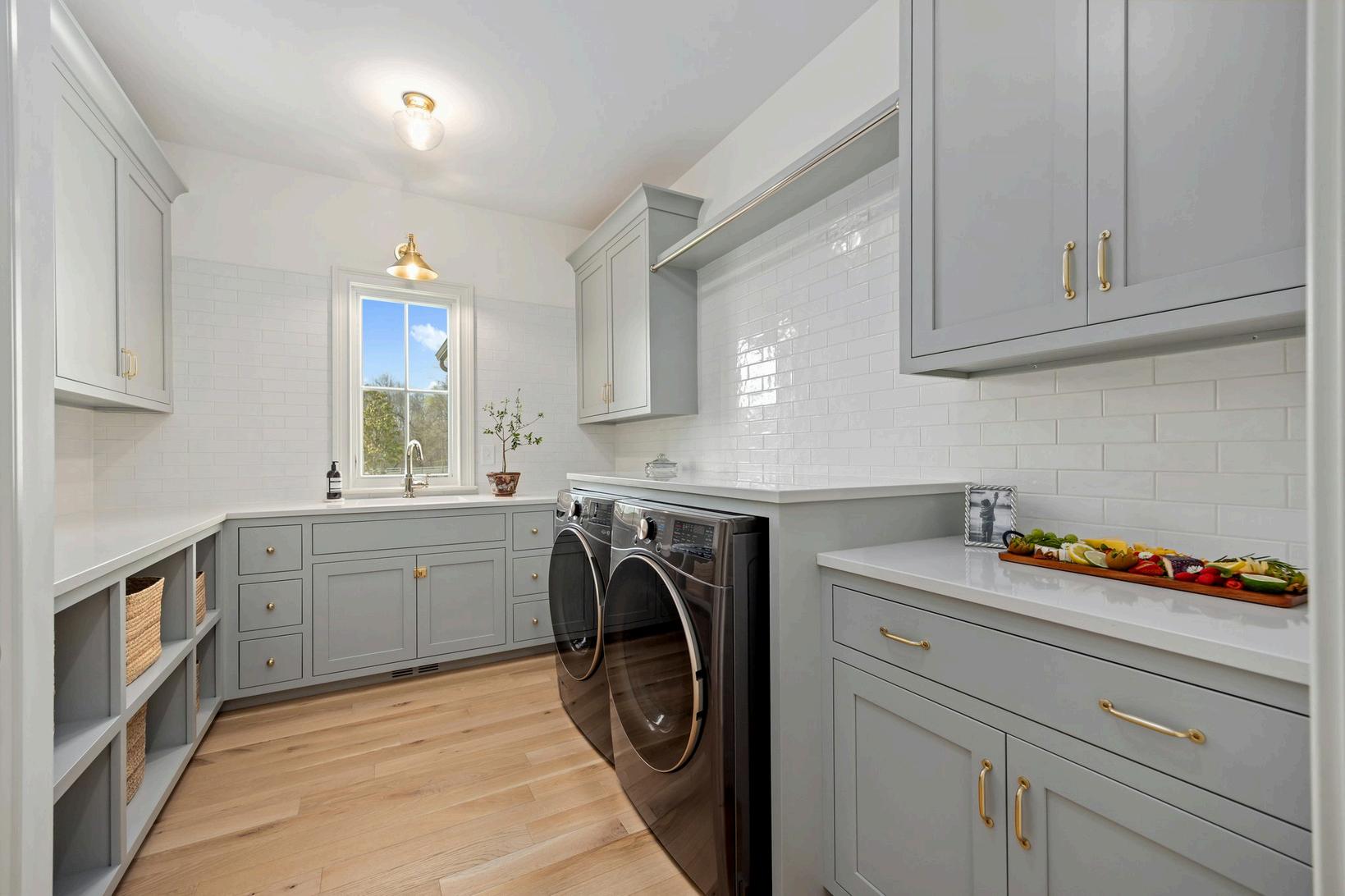 The abundance of storage. We wanted all our things to have a designated "home" so we designed each space with that in mindopen shelves for baskets in the LR to sort laundry, office cabinetry with metal grates and outlets to house a printer, linen cabinet/shelves in the bathrooms for towels and toiletries.