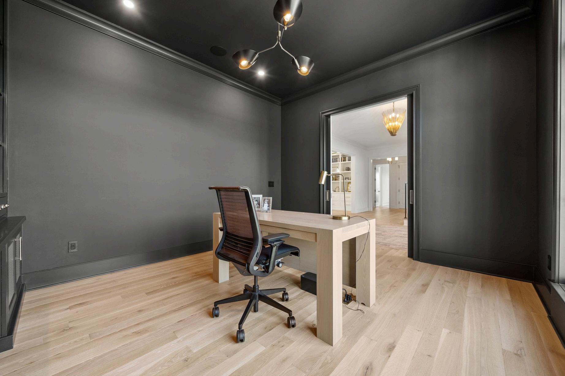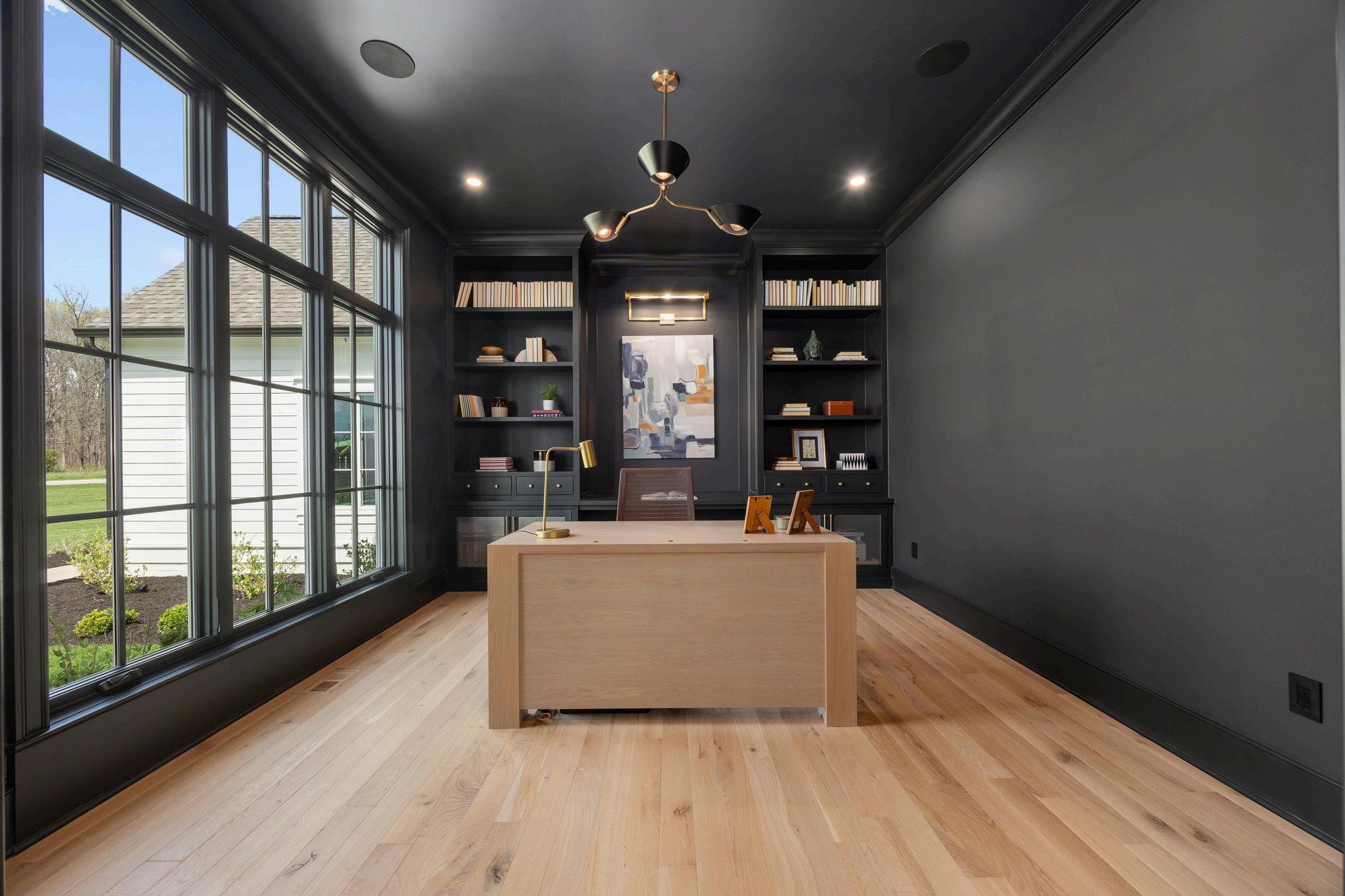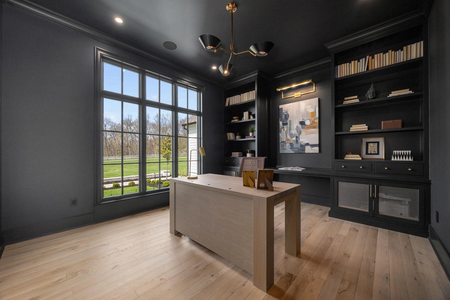Sleek, sophisticated office features custom built-ins designed to showcase books, art, and photos with elegant, integrated lighting. Floor-to-ceiling windows flood the space with natural light, while pocket doors add classic charm and a sense of openness. Rich materials and clean lines create a refined, inspiring atmosphere perfect for focused work and creativity.