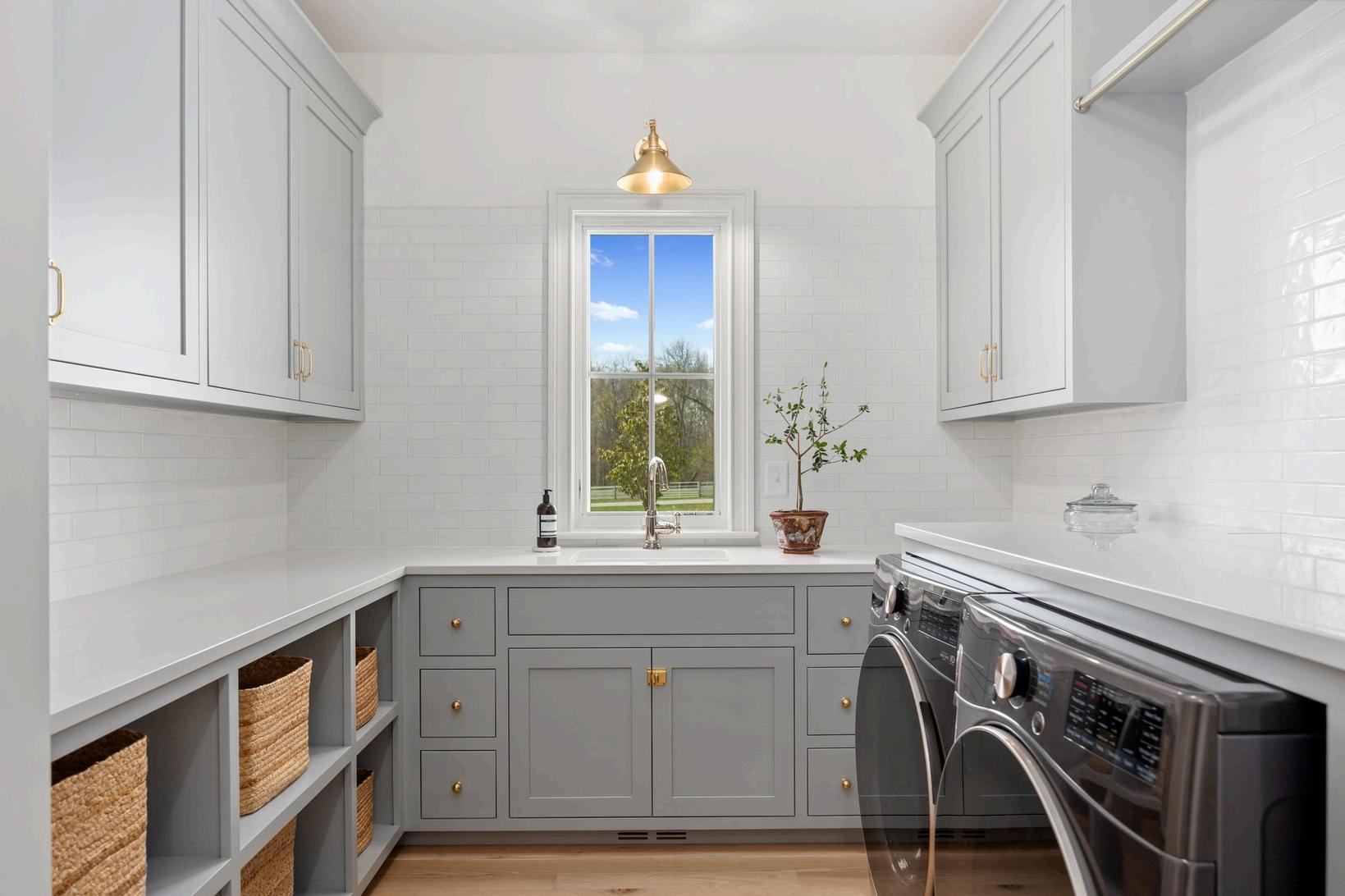 This meticulously designed and custom-built 12x16 butler’s pantry functions as a 2nd kitchen. It’s perfect for meal preparation and storage. Floor-to-ceiling cabinetry is Amish built w/ dovetail design, 23 shelves, 8 large drawers, vertical baking storage, and hookups for small appliances. Granite counters, a Bosch refrigerator, a paneled KitchenAid dishwasher and undermount full-size sink. It’s truly a beautifully crafted functional extension of the gourmet kitchen.