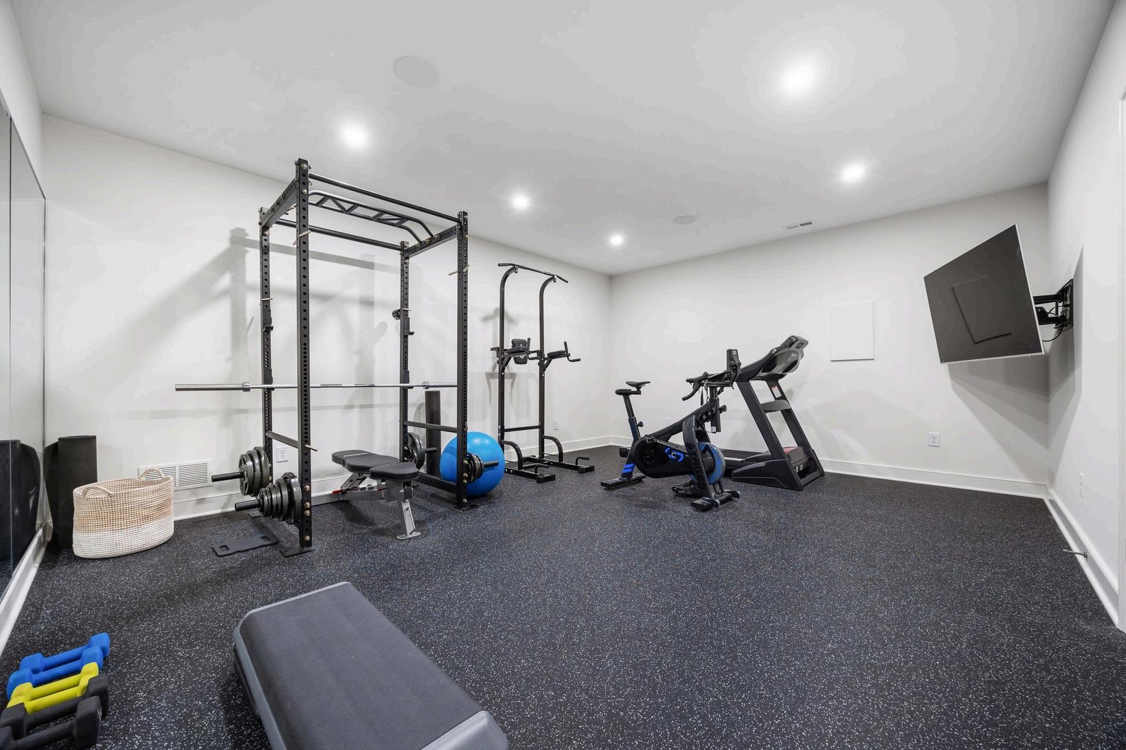 Stay fit without ever leaving home in the dedicated home gym, featuring professional gym flooring, a full wall mirror, and a TV hookup for streaming workouts or entertainment. This thoughtfully designed space makes it easy to prioritize health and wellness from the comfort and convenience of your own home.
