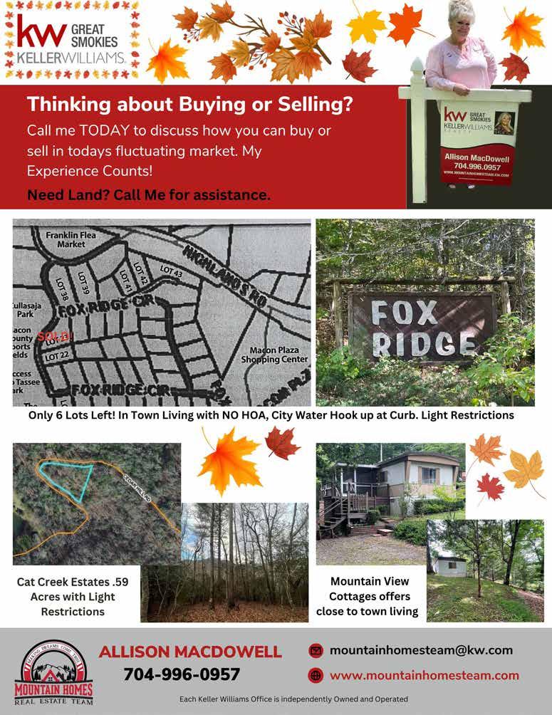www.BeckyRameyNC.com THE REAL ESTATE BUYER’S GUIDE • FRANKLIN, NC NUMBER 418 • PAGE 37 $25,000 $779,900 $89,900 INCREDIBLE VIEW STUNNING ACREAGE 1296 E. Main St. Franklin, NC 28734 828-349-4600 Fax: 828-369-5949 Katelyn VanderWoude Broker 828-371-7857 katev@remax.net HOUSE PAD IN PLACE $499,000 UNRESTRICTED $58,000 2 SIDE-BY-SIDE LOTS $12,900 CLOSE TO TOWN $249,900 YEAR-ROUND VIEW • 9.21 Undeveloped Acres • Some Roadway in Place • Near New Hospital • Inside City Limits • Nice Laying Property • Great Visibility from Roadway • MLS #26029177 $798,000 PRIME LAND $109,900 COMMERCIAL LOT • 3.26 Acres • Overlook Busy Rt. 441 • Possible Public Utilities Available • Wooded Acreage • High Traffic Area • MLS #26031112 • 0.65 Acre • Close to other Businesses • High Traffic Area • Public Utilities Available • Level Lot • MLS #26031114 $159,900 GOOD POTENTIAL • 0.82 Acre • Highly Visible/ Traveled Road • Walking Distance to Downtown • Paved Parking • MLS #26031057 $310,000 INCOME PRODUCING • 14.17 Acres • Gentle Laying Land • Exceptional Long-Range View • Multiple Building Sites • Only 10 Minutes from Town • MLS #26030416 • 1.29 Acres • Great Laying Land • Year-Round Views • Gated Community • Partially Cleared Building Site • Roughed-in Driveway • 3000 ft. Elevation • MLS #26031420 • 31.32 Acres • Spring, Stream, Small Waterfall • Old Homestead • Level to Rolling Acreage • Wooded • MLS #26030346 • 4.12 Acres • Rolling Property • 4 Lots • Close to GA/NC Border • MLS #26030441 • 61.90 Acres • 2 Large Areas Pasture • Some Woods • Stream • Numerous Building Sites • 10 Minutes from Town • MLS #26030339 • 5.43 Acres Total • Can Purchase Separately • Sapphire Hills Development • Great View Potential • Paved Roads • Underground Utilities • MLS #26029610 • 0.48 Acre • Wooded • View Potential • City Water Available • MLS 26028983 • 10+/- Acres • Long Range View Potential • Multiple Building Sites • Power Lines to the Top • Privacy • MLS #26030738 $85,000 PRICE REDUCED