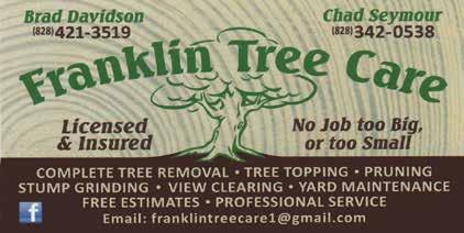 FEATURED SERVICES THE REAL ESTATE BUYER’S GUIDE • FRANKLIN, NC NUMBER 418 • PAGE 6 828-421-9891 • kittycatcreek@yahoo.com REPRESENTING BUYERS AND SELLERS FOR 23 YEARS! Call me today to list your property! With 23 years experience in Western North Carolina & North Georgia, I will get it SOLD for TOP DOLLAR! NEXT DEADLINE: SEPTEMBER 29 Connecting Real Estate Buyers and Sellers Since 1977 Stop by our office at 720 Highlands Road Franklin, NC 28734 or call/email Luke or Rhonda Bateman Cell: (828) 421-3257 Office: (828) 349-5845 info@TheREBG.com BrysonCityHotTubs.com 114 Everett Street, Bryson City, NC 28713 828-788-2039 brysoncityhottubs@gmail.com Sales, Repairs, Cleaning/ Chemical Services Available Local delivery and removal starting at $175 Bryson City Hot Tubs 2590 HIGHWAY 19 SOUTH, BRYSON CITY, NC 28713 • (828) 269-8290 • fonziestradingpost@gmail.com FREE CUSTOM DESIGNS CARPORTS • SHEDS • GARAGES • HORSE BARNS • STORAGE UNITS CUSTOM WATERWHEELS • RENT-TO-OWN • CUSTOM ORDER • FREE DELIVERY & SET-UP FONZIE’S TRADING POST