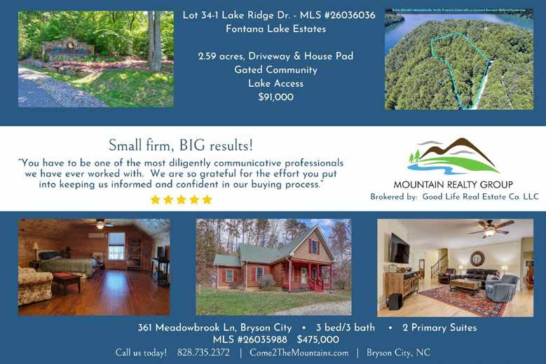 Ruth Ann Nilges, Broker Office: 828-488-9858 Cell: 828-507-9168 ranilges@frontier.com 80 East Deep Creek Circle (By Appt.) PO Box 269 • Bryson City, NC 28713-0269 Contact Me Today to Represent You, Whether Buying or Selling! FEATURED SERVICES Call 828-421-3257 or luke@therebg.com NEXT DEADLIINE: MAY 3 SMALL (As low as) $33/ISSUE MEDIUM (As low as) $61/ISSUE LARGE (As low as) $90/ISSUE SEE YOUR AD HERE!