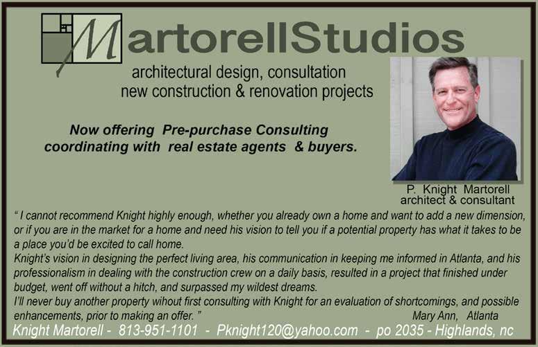 THE REAL ESTATE BUYER’S GUIDE • HIGHLANDS, NC NUMBER 369 • PAGE 4 Doug Houston Mortgage Loan Officer NMLS #113413 Georgia Residential Mortgage Licensee #32731 Office: (828) 348-8680 Cell: (828) 332-2377 dhouston@smprate.com The Doug Houston Team www.dougshomeloans.com Georgia Residential Mortgage Licensee #36474 Licensed in TN, NC & GA “Success is what we’re about, mortgages are what we do, and partners is how we treat everybody.TM” 131 Heritage Hollow Drive Suite 2 Franklin, NC 28734 828.421.1115 | Tim Sadlon | SadlonandAssociates.com Cashiers & Highlands Since 1992 Highlands 828.526.3713 www.wayah.com HOME•AUTO•LIFE•HEALTH RETIREMENT•COMMERCIAL•EMPLOYEE BENEFITS Jeff Cloer Mike Norris Mike Wood Jessica Jenkins SIGN UP TODAY! eNews Send your request to info@TheREBG.com COMPLETE TREE REMOVAL • TREE TOPPING PRUNING • STUMP GRINDING VIEW CLEARING • YARD MAINTENANCE FREE ESTIMATES • PROFESSIONAL SERVICE Email: frankintreecare1@gmail.com