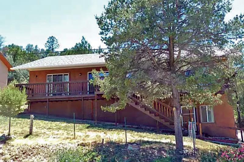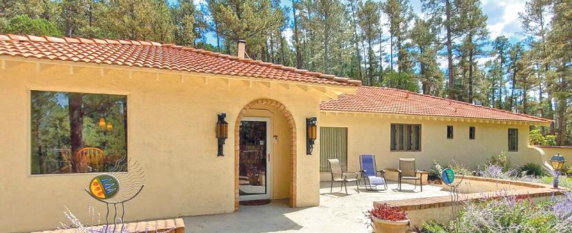 NICE SOUTHWEST STYLE MTN HOME on large lot w/ circle driveway & courtyard entry. 1-level, furnished, features high-beamed ceilings, kiva FP & open living, dining & kitchen. Primary bdrm is private from other bdrms & bathroom. Sunroom runs length of the home & includes mini kitchen. Would make great den, game room, art studio, etc. Single car garage. $549,000. #128826. Call Diane Beloat.