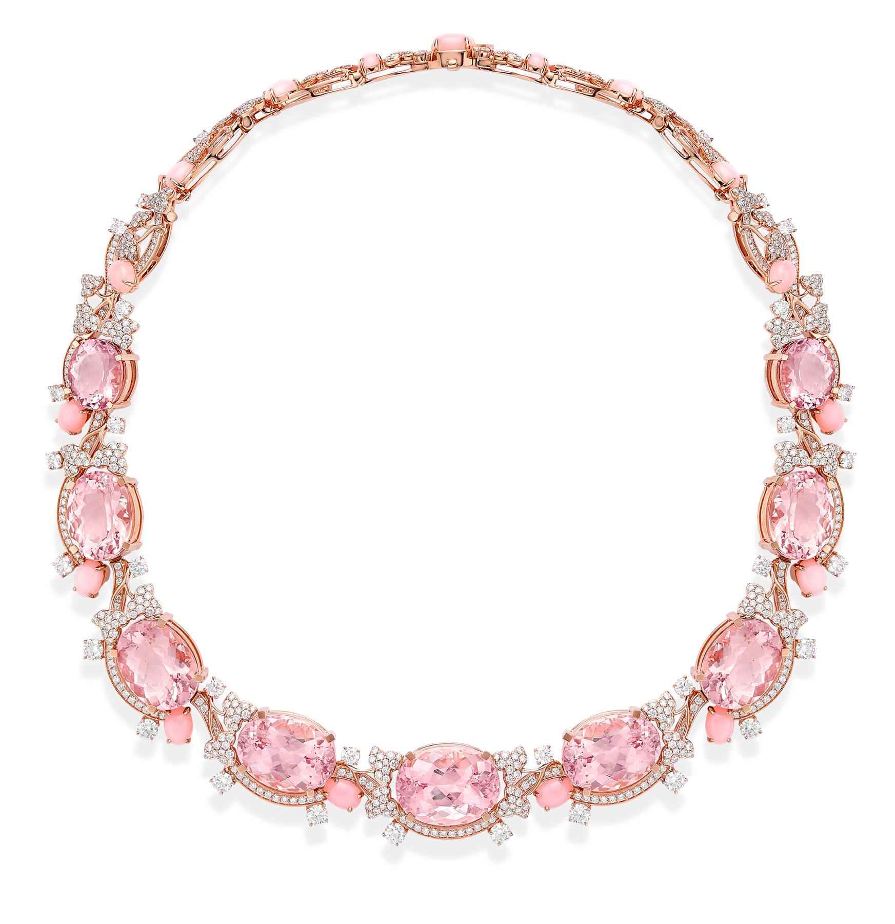 A Column and Ivy design necklace set with oval cut morganites, pink opals and diamonds in 18 carat SMO rose gold. The total weight of the 9 morganites is 95.01 carats and 17 pink opals is 11.54 carats. The total weight of the main 48 brilliant cut diamonds is 7.27 carats and additional diamonds is 7.45 carats. Part of the Secret Garden Collection.