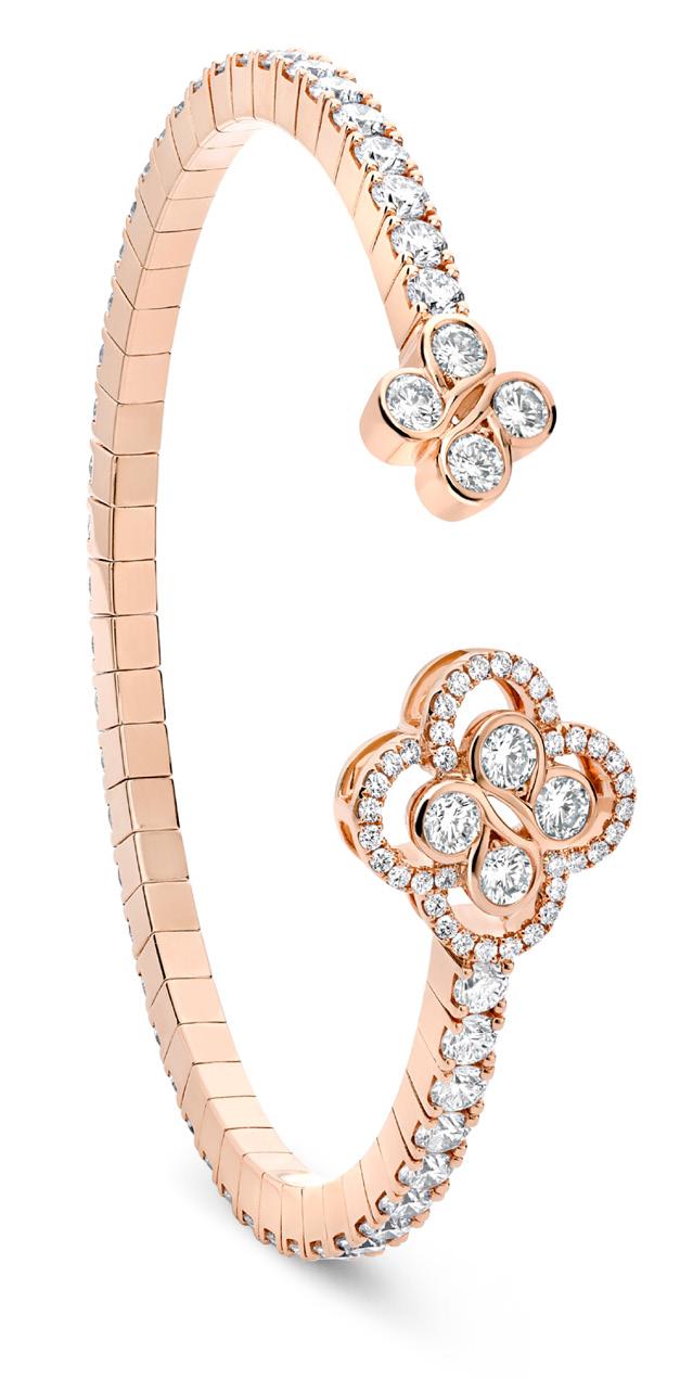 ‘Be Boodles’ Rose Gold Diamond Bangle. An elegant design with mirrored pairs of diamond-set ‘B’ motifs, poised elegantly in this bangle, from the Be Boodles collection. This bangle is set with brilliant cut diamonds in 18 carat SMO rose gold. The total weight of diamonds is approximately 5.70 carats.