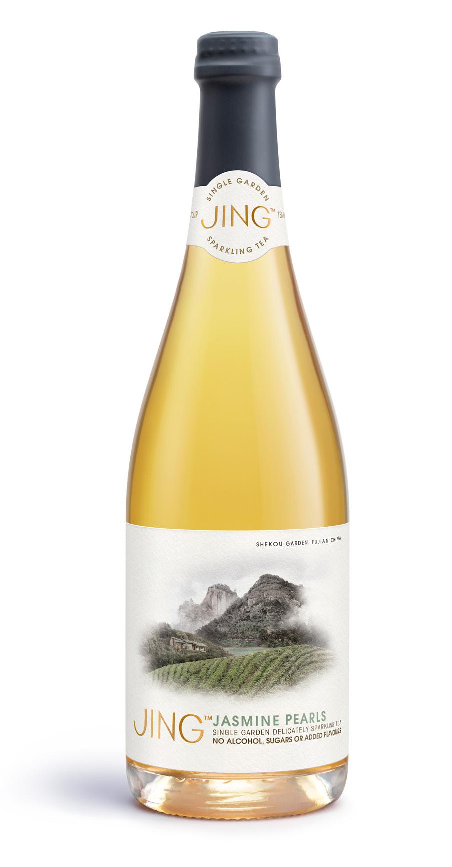 Jasmine Pearls Sparkling Tea. A delicate fizz with a delicate jasmine aroma, bright green tea taste with beguiling lingering notes of honey and stone fruits. A soft drink by nature, but with impactful, memorable flavour.