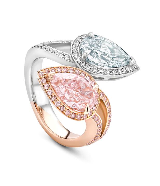 Gemini Pink Diamond Ring. The Gemini Ring featuring a certificated 2.04 carat pear cut, Fancy Light Purplish-Pink and a 2.03 carat Fancy Light Blue pear cut diamond are perfectly poised alongside one another to evoke feelings of unity and harmony. Handcrafted in a platinum and 18 carat SMO rose gold setting, by Boodles.